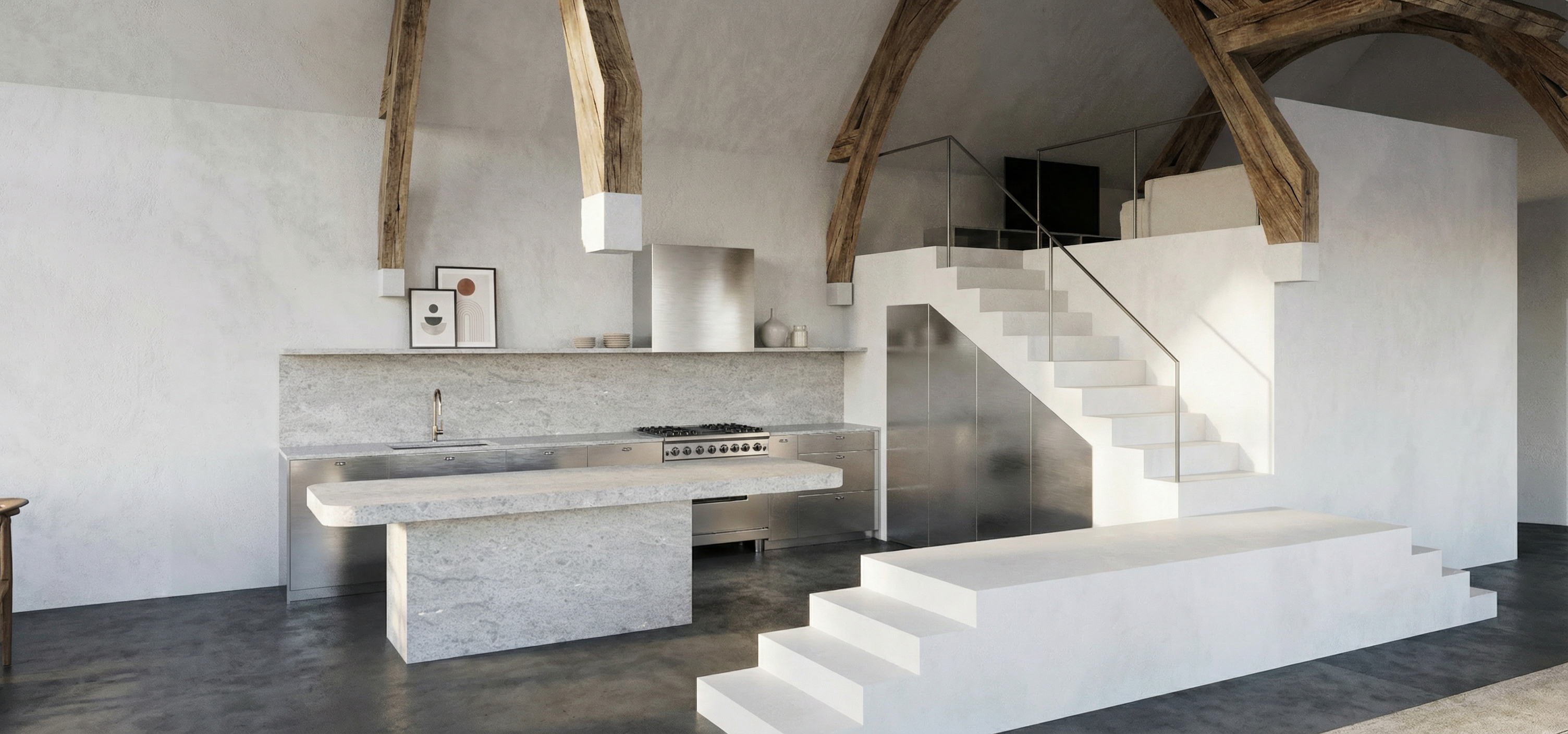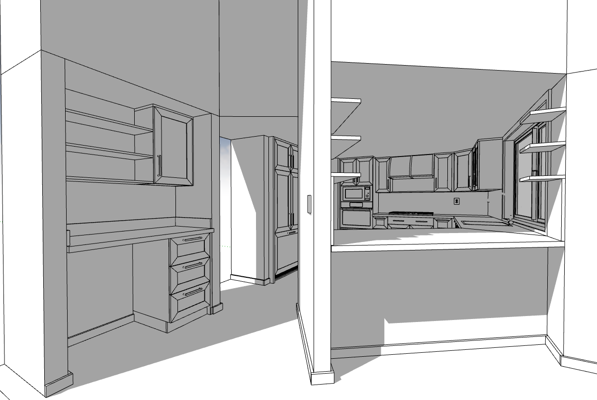 modern craftsman kitchen dark stone marble countertop maple floors medium tone wood cabinets with soft sunset lighting coming from the right east