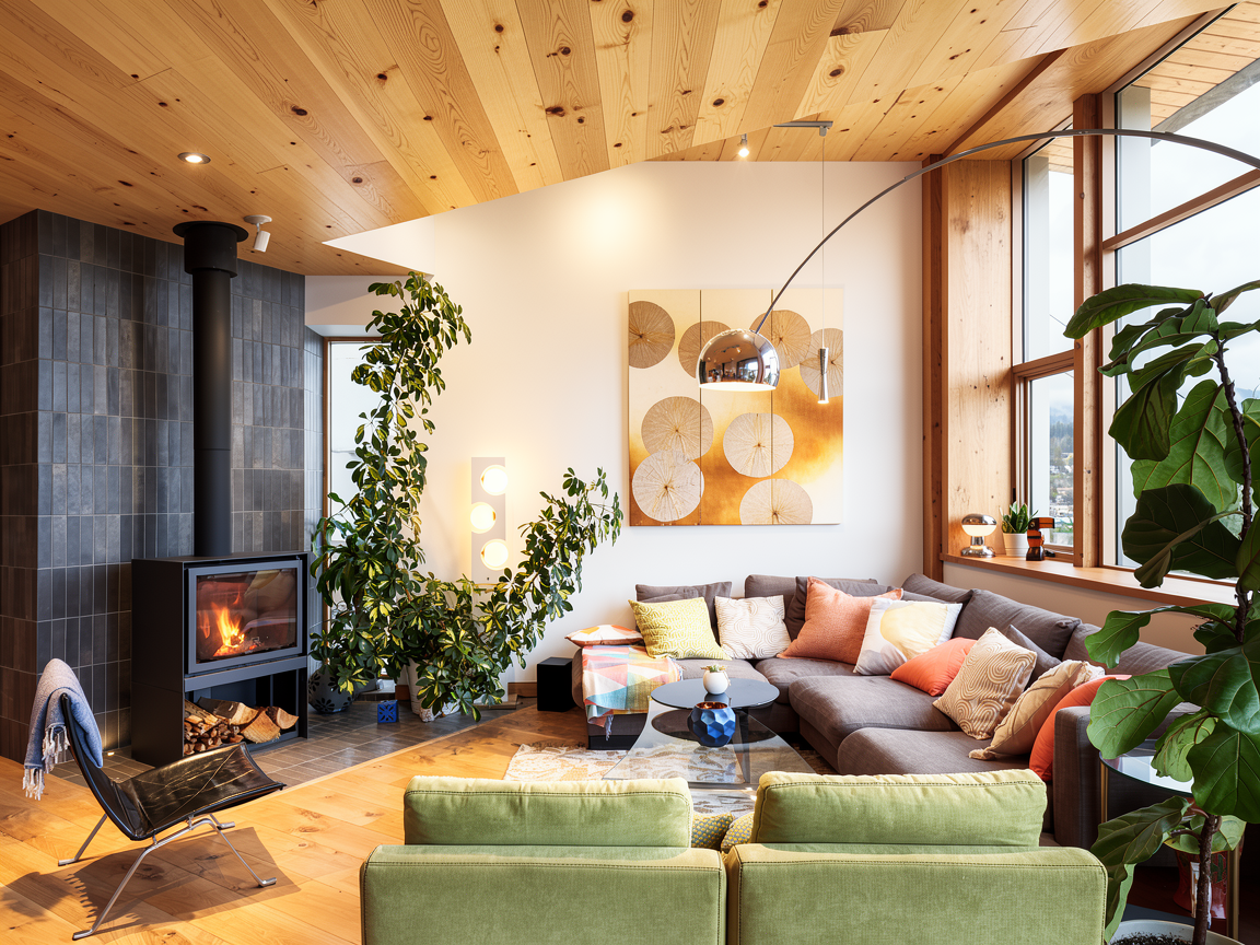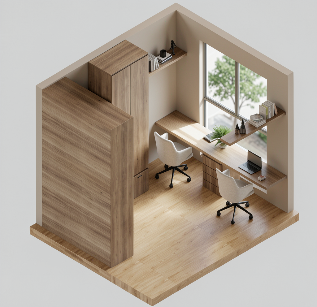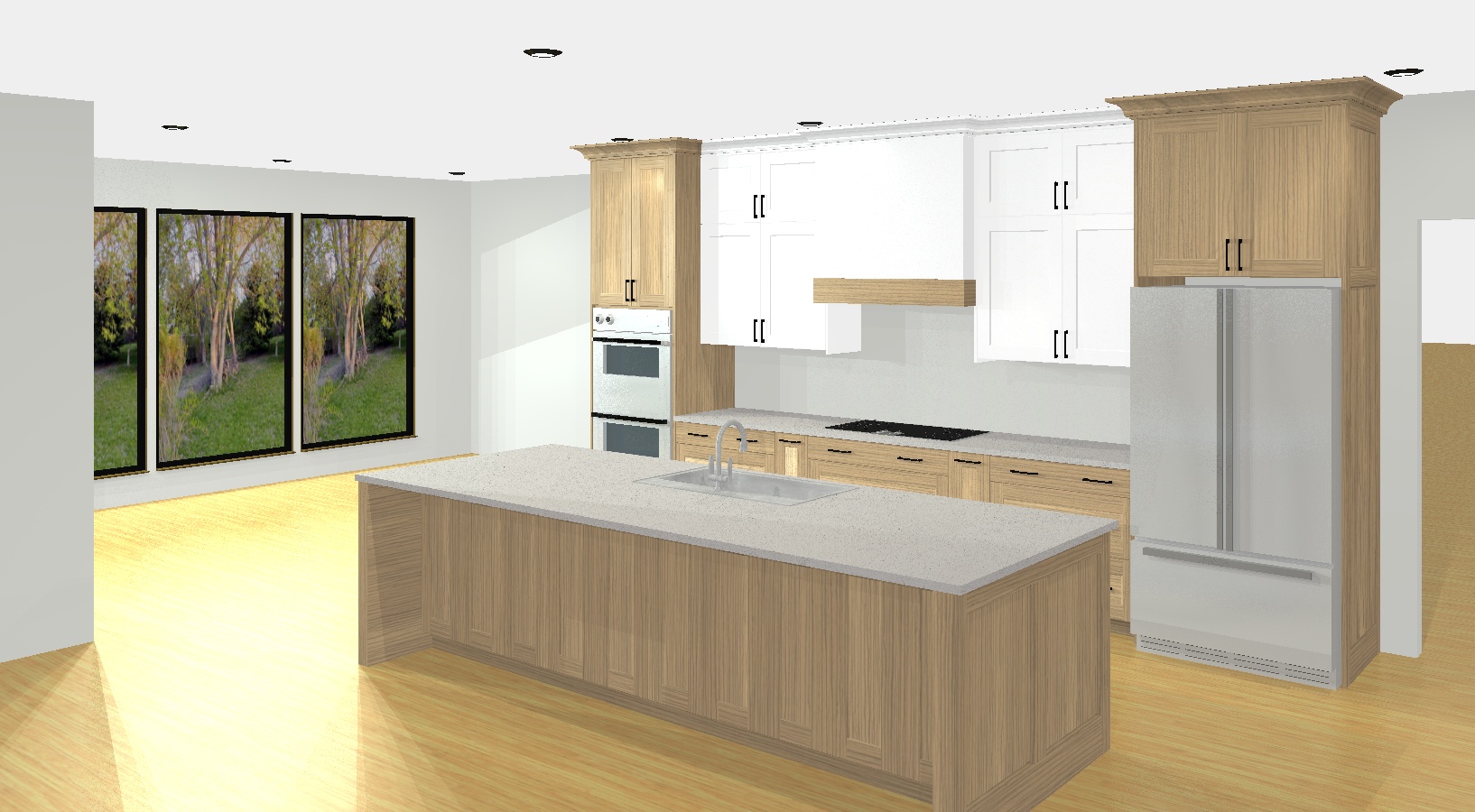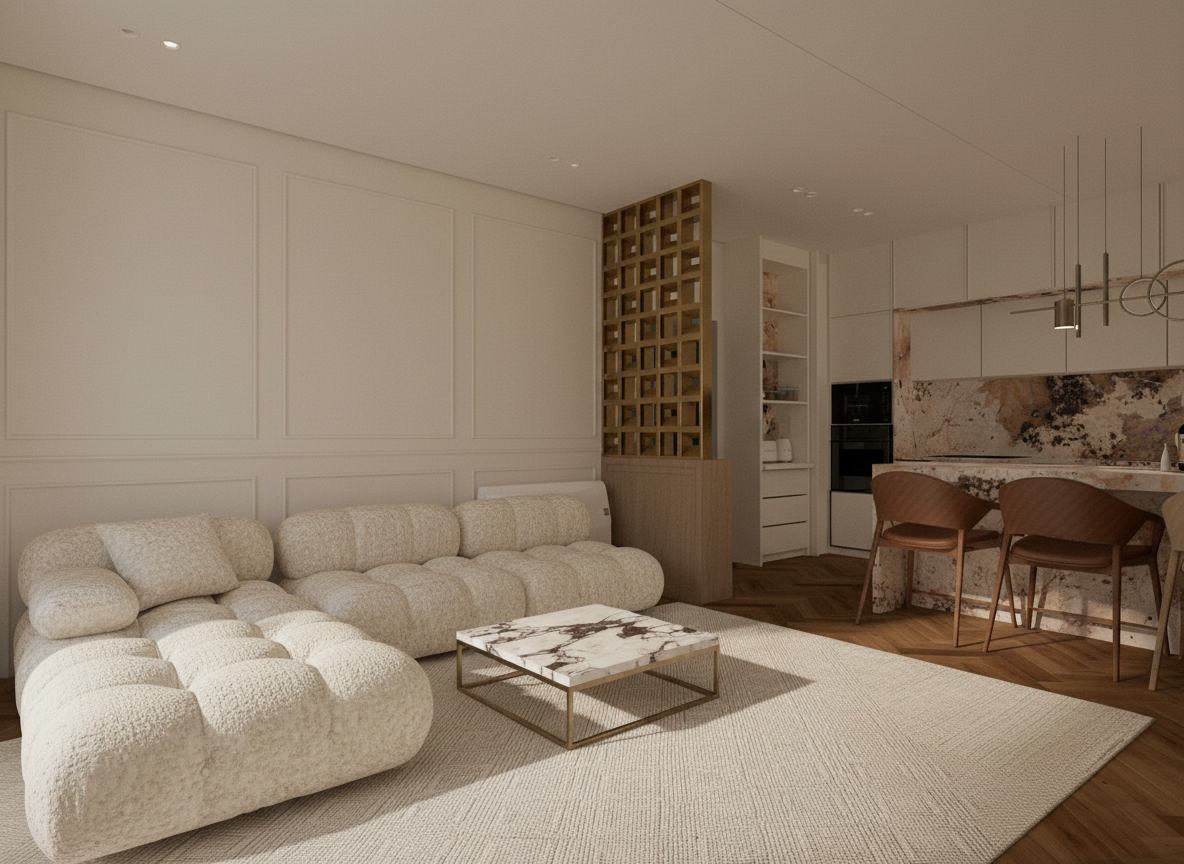 a beautifully lit modern kitchen featuring a sleek light white upper cabinets with elegant panel doors and gold handles surrounded by rift white oak fridge and oven and island cabinetry the countertop is a smooth neutral white granite accentuating the polished brass faucet soft warm white lighting casts gentle shadows creating a cozy and inviting atmosphere the surrounding walls are a subtle off white complementing the natural wood toned floor evoking a sense of warmth and comfort