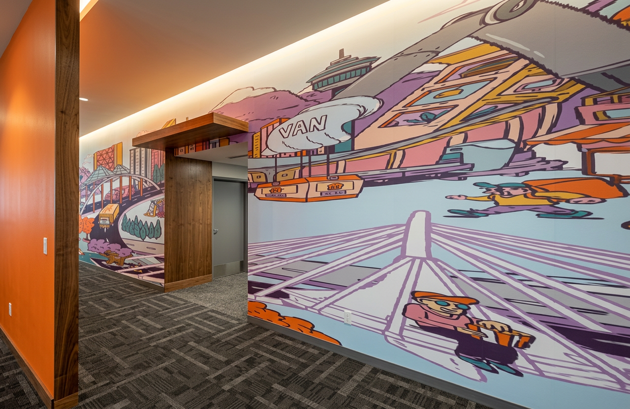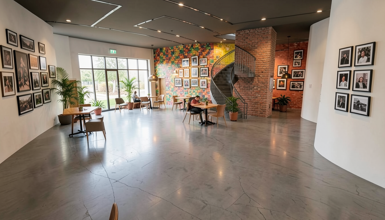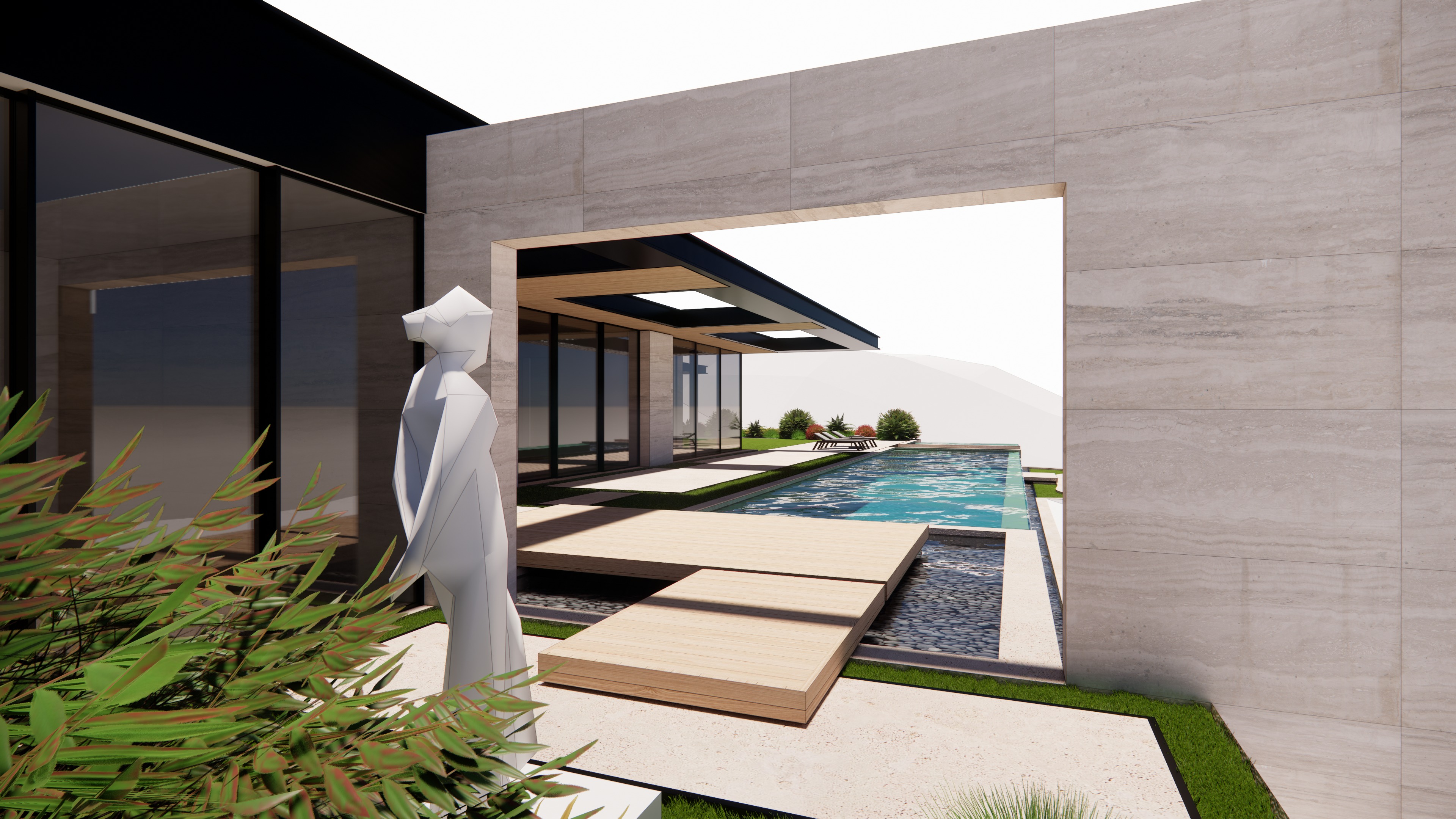 create a photorealistic rendering this is a closer view of the wall opening it is focusing on the water feature and pool area the walls are travertine stone tile the raised platforms are wood the floors and the stairs are limestone the long pool is green turquoise tile it has an infinity edge the landscape in this area should include succulents bushes and flowers the glass sliding door mullions are matte black the metal structure of the roof is also matte black there are rectangular openings in the roof structure on the left side that allow for sunlight to go through in the foreground is a marble sculpture do not change any of the design or the view angle