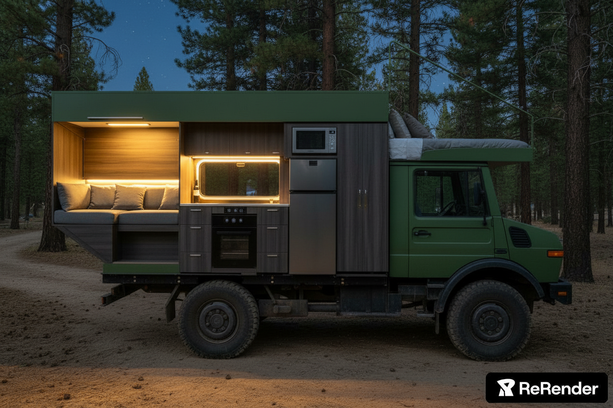 modern detail shot render a luxurious camper van interior with modern design incorporating soft grey cushions and a cozy seating area in light tones the wood cabinetry should be a rich espresso brown with stainless steel appliances for a sleek look the atmosphere inside is warm and inviting with soft ambient lighting illuminating the space include a scenic window view to enhance the cozy atmosphere the exterior of the van is a matte grey tone featuring robust tires and minimalist lines architecture