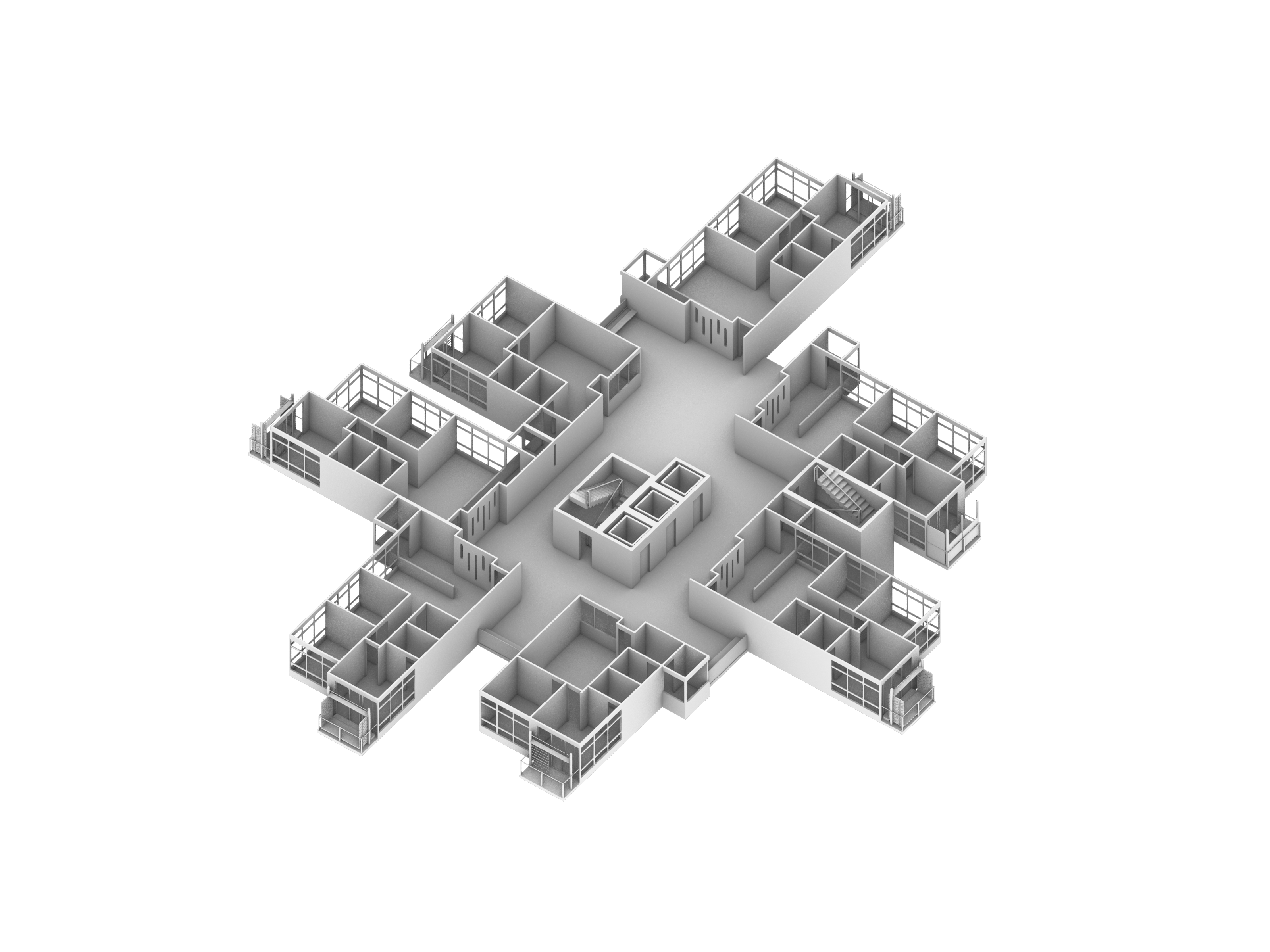 minimalism interior from the top add in people and life plants and furniture make it a semi realistic render of a high rise high density apartment floor architecture