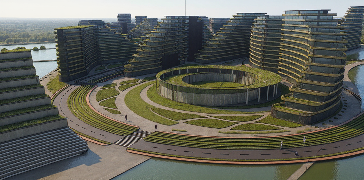 place high and low vegetation trees flowers bushes on the green area also put cars on the road and put flower gardens on the cascading terraces