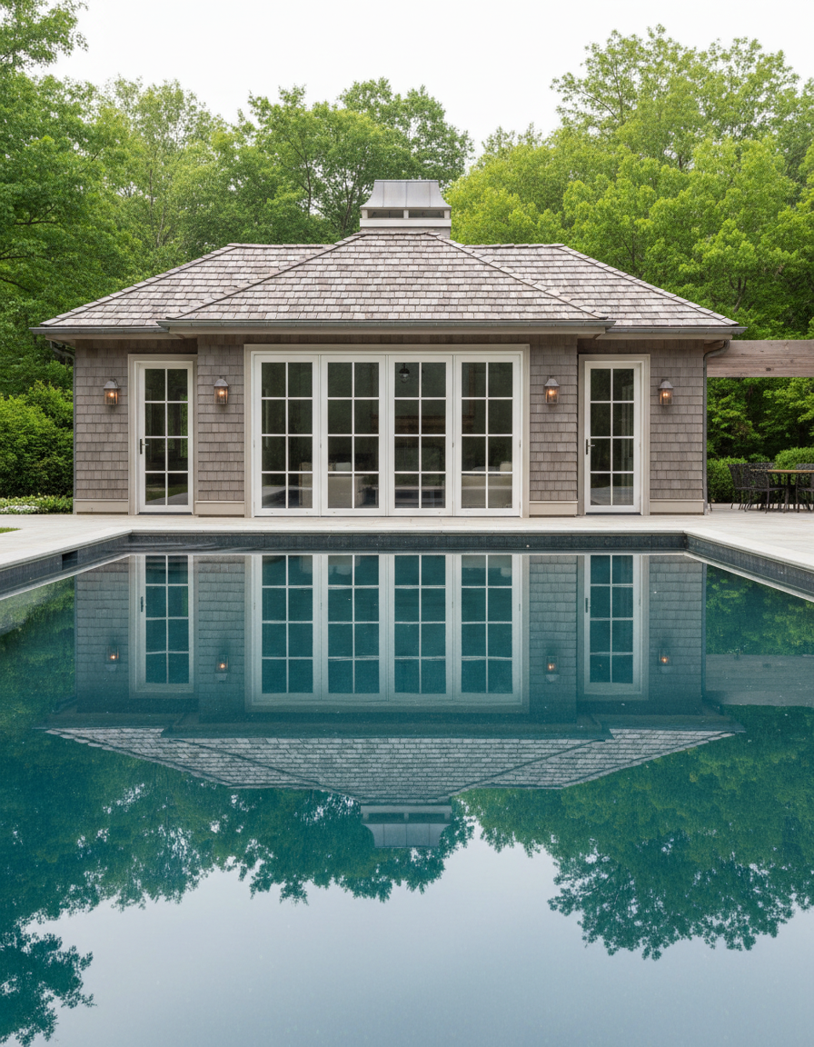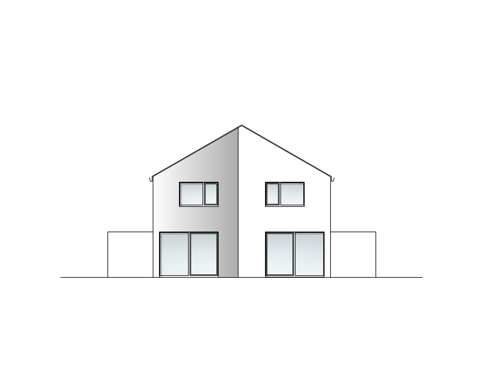 exterior shot very simple presentation white facade summer vibe with clouds add some trees grey window frames no flowers lawn in front architecture