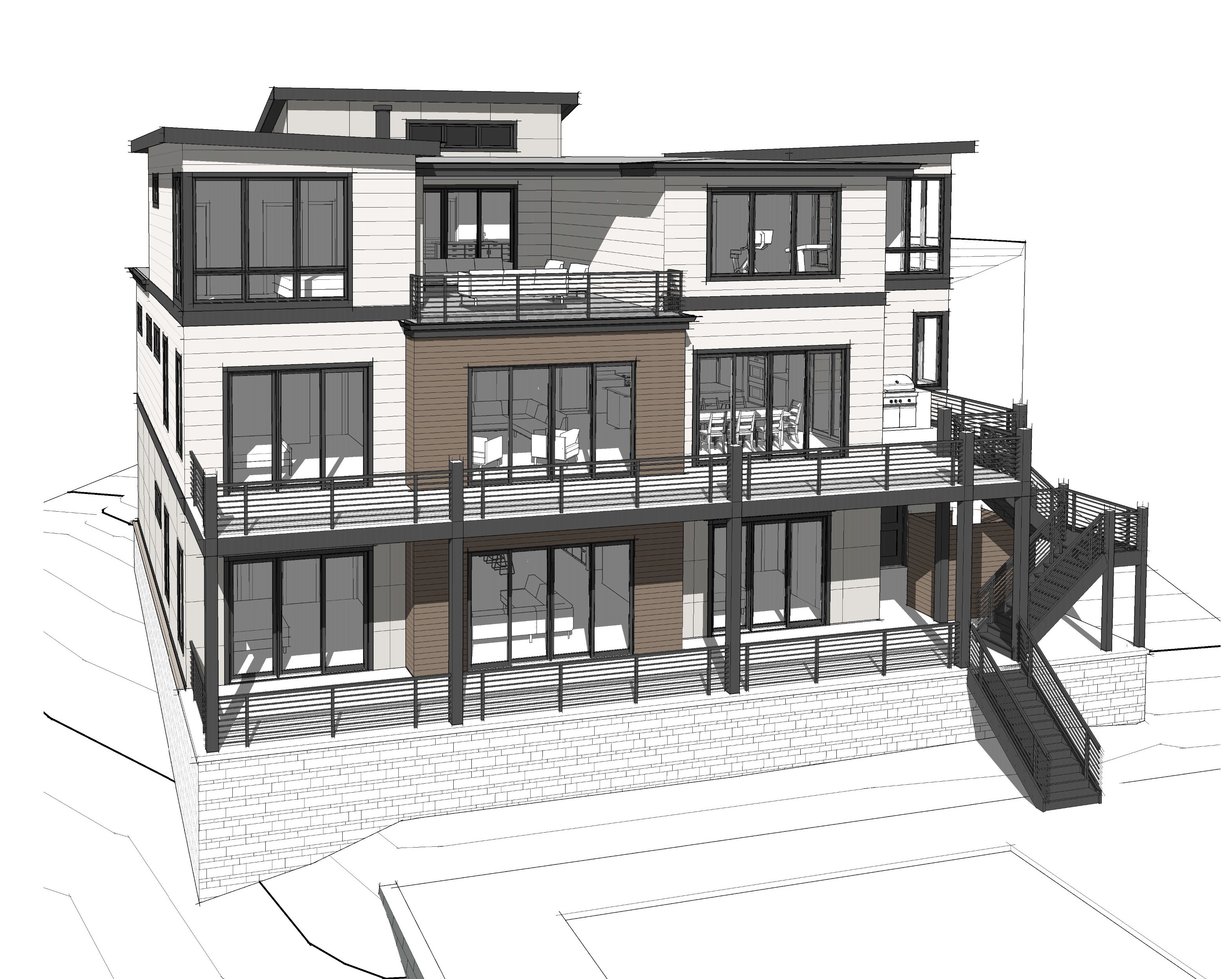 setting in woods on sloping hill pool area in front