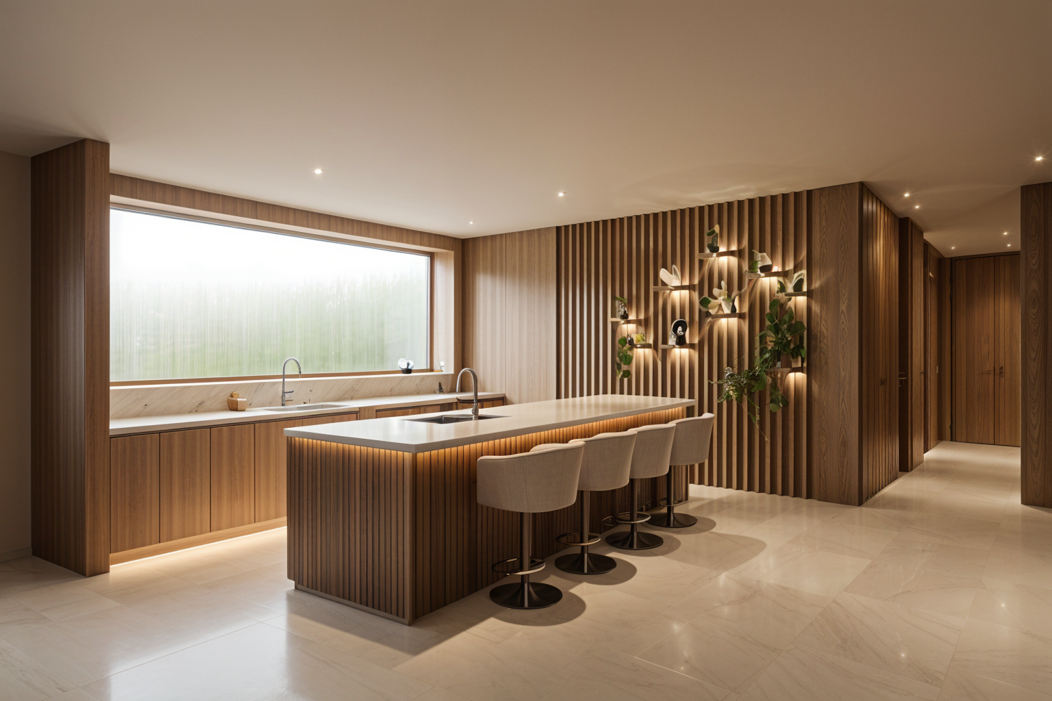 maintain original layout add three skylights to centre of back room ceilings are white plaster doorframes at front are black metal preserve all architecture furniture and layout exactly as shown do not redesign move or replace any objects only enhance materials and lighting