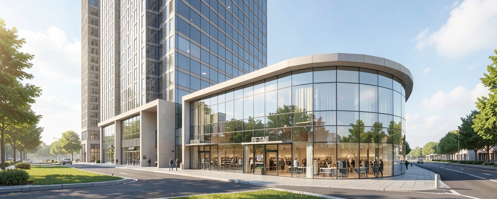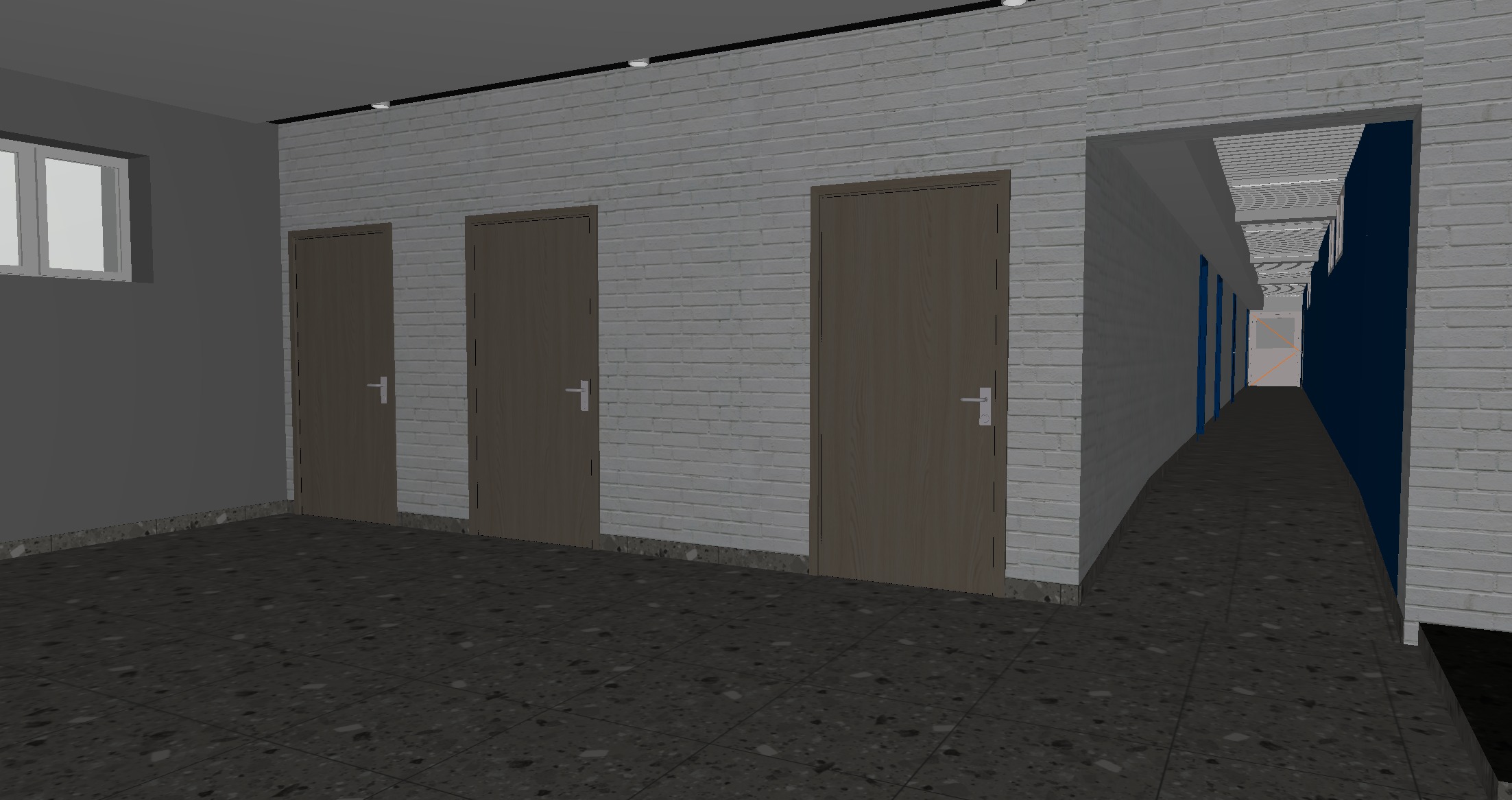 photorealistic visualization of a narrow corridor bright and modern interior on the floor 60x60 cm matte terrazzo porcelain tiles walls made of white painted brick with a subtle texture and delicate shading smooth light wooden doors vicenza oak modern door leaf without glazing wall mounted spot lighting and elongated linear fixtures soft warm neutral lighting 4000k realistic shadows global illumination high level of detail natural proportions wide angle view high resolution modern minimalist style