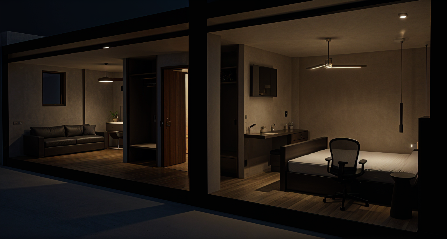 evening time lights on keep original floor white background keep the ceiling fan remove extra lights paint walls beige gray intense light linear light above the side cabinet brighter image