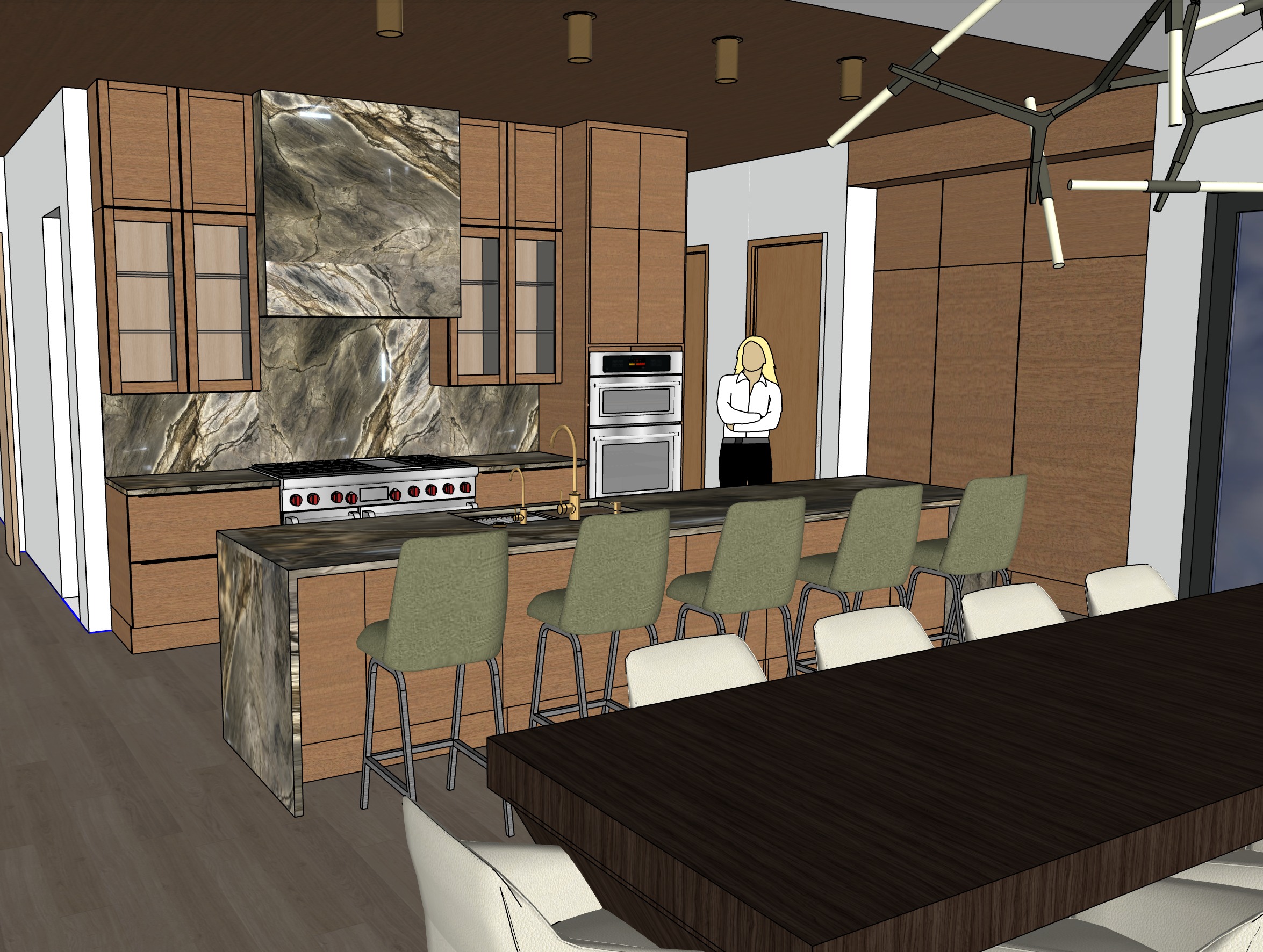 make the cabinet doors to the left and right of the range hood thin black metal frames with reeded glass inserts the upper doors should be solid wood and flat front