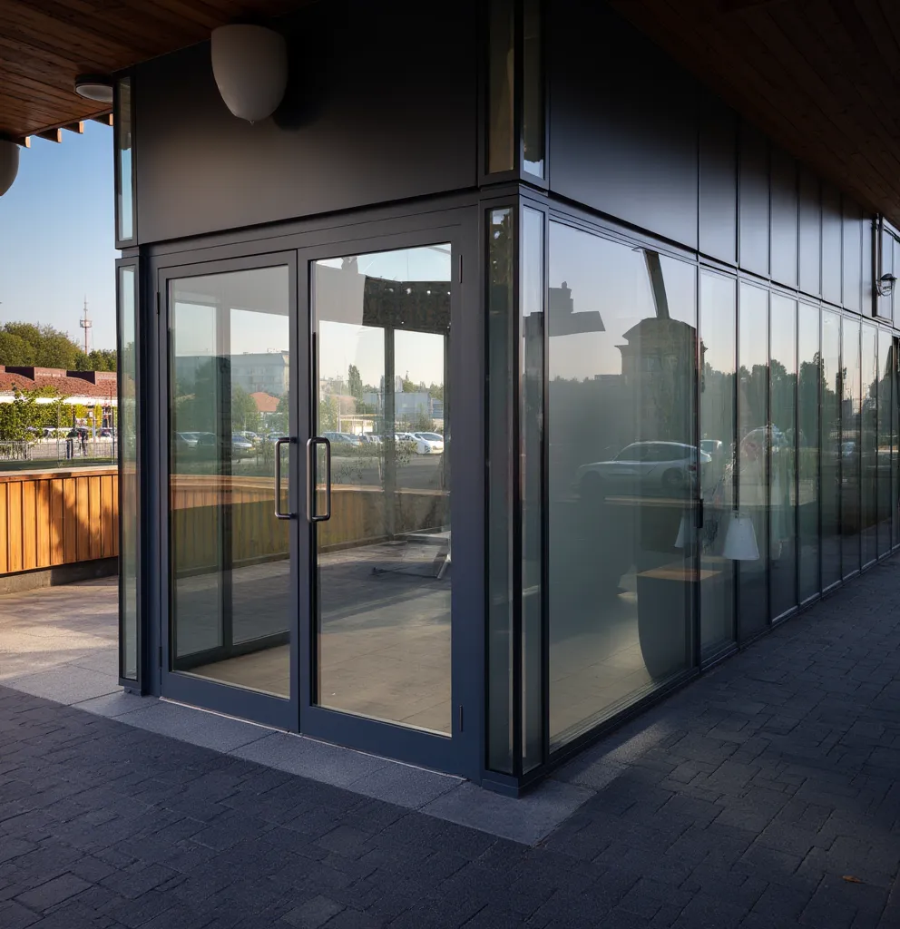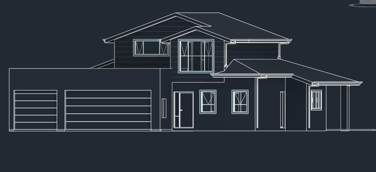 this external facade of this house is made up by rendered plaster the pop out box of the garage has a gray face brick finish the loft has a white weatherboard finish it has charcoal chromodeck roof sheeting it has a single and double sectional garage doors in black please add a car in the driveway