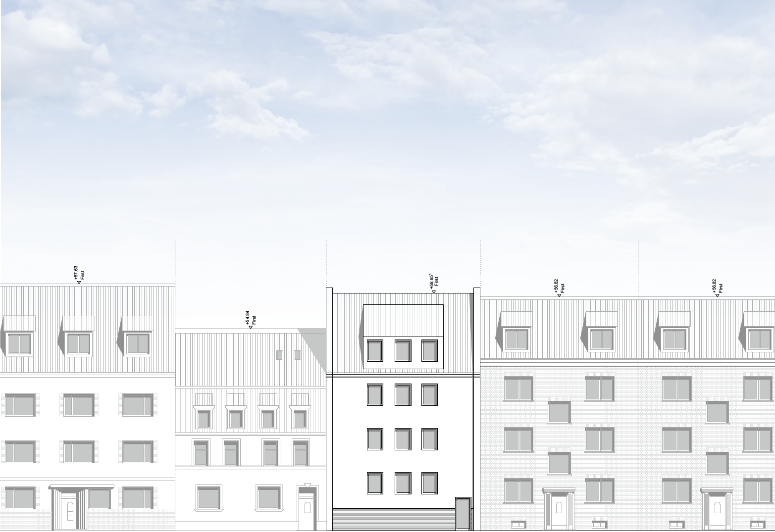 chatgpt hyper realistic elevation rendering of an urban residential row with plastered fa ades in light tones fine brick textures realistic windows with subtle reflections detailed roofs with tiles and dormers metal gutters and a calm daylight atmosphere under a slightly overcast sky