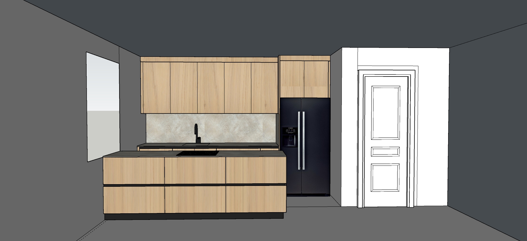 render this kitchen with details add led under the upper cabinets on the right there is a window
