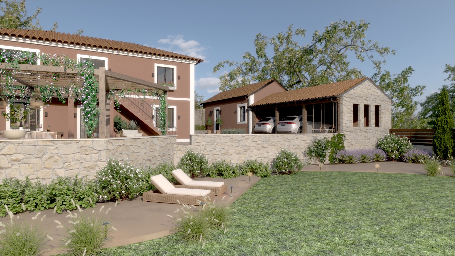 create a serene and picturesque mediterranean villa with a soft warm atmosphere render a two story house in earthy terracotta with white accents surrounded by lush greenery incorporate a rustic stone wall in beige topped with a wooden pergola entwined with vibrant green vines and delicate purple flowers add two inviting wicker sun loungers with cream cushions on a patio include a gravel driveway leading to an open garage with two cars the garden should have manicured grass and diverse shrubs with white and purple flowers set under a bright blue sky with fluffy white clouds casting gentle daylight enhance the scene with a peaceful and tranquil ambiance