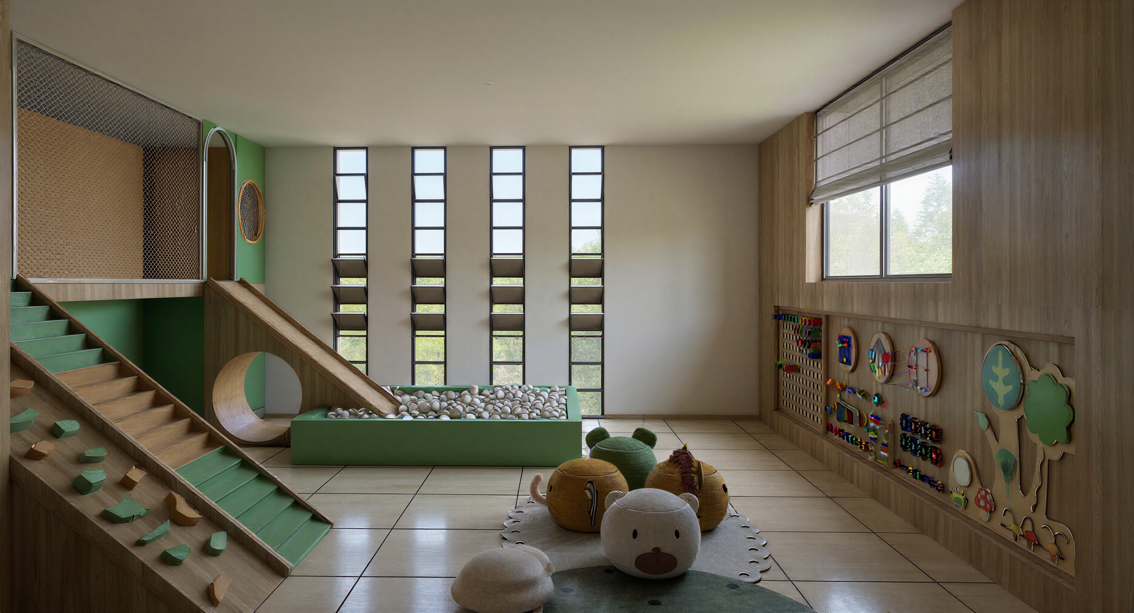 generate a highly realistic video based on the provided image keep all architectural and interior characteristics exactly as they are transform the scene into a lively kids playroom filled with natural lighting add three children playing together in the space interacting dynamically with toys running around laughing and moving naturally maintain a bright cheerful atmosphere with soft natural sunlight entering through the windows complemented by subtle artificial lighting to enhance clarity ensure that the movements shadows and reflections look lifelike and consistent with the original environment