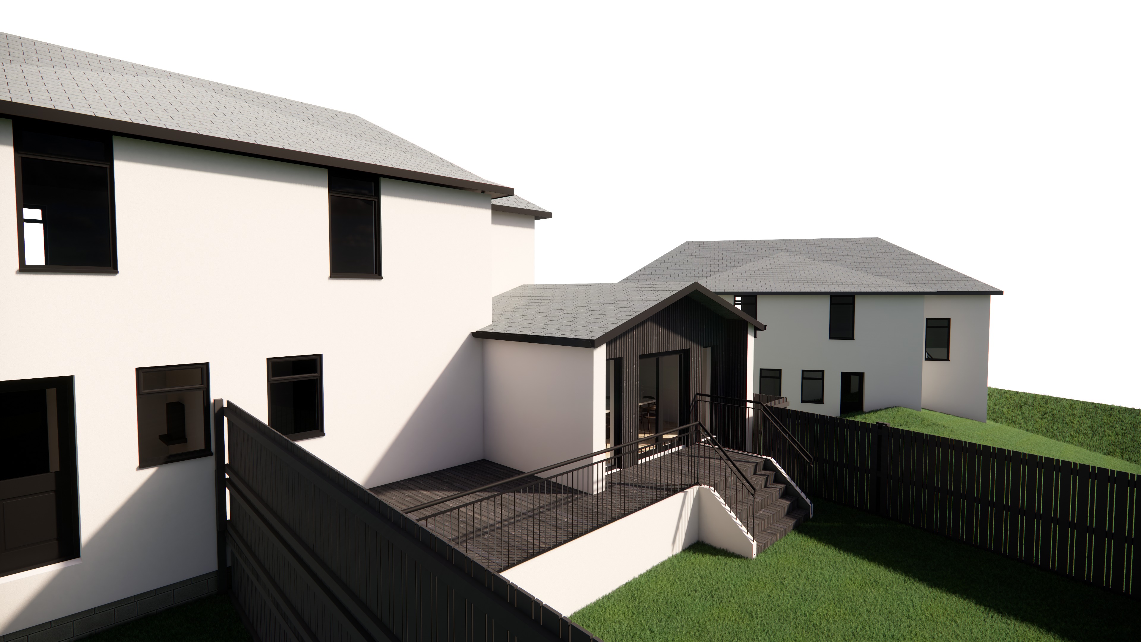 make this render realistic add sky and trees to background white external walls sound be a very ligth cream render with the timber feature walls being black timber battens with deep recess joints