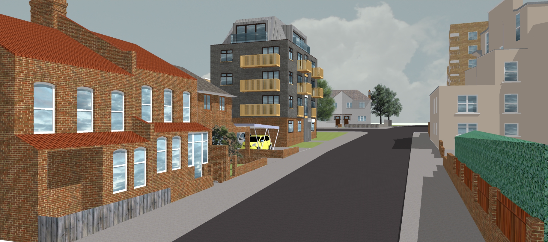 south london street scene with cars people and blue sky