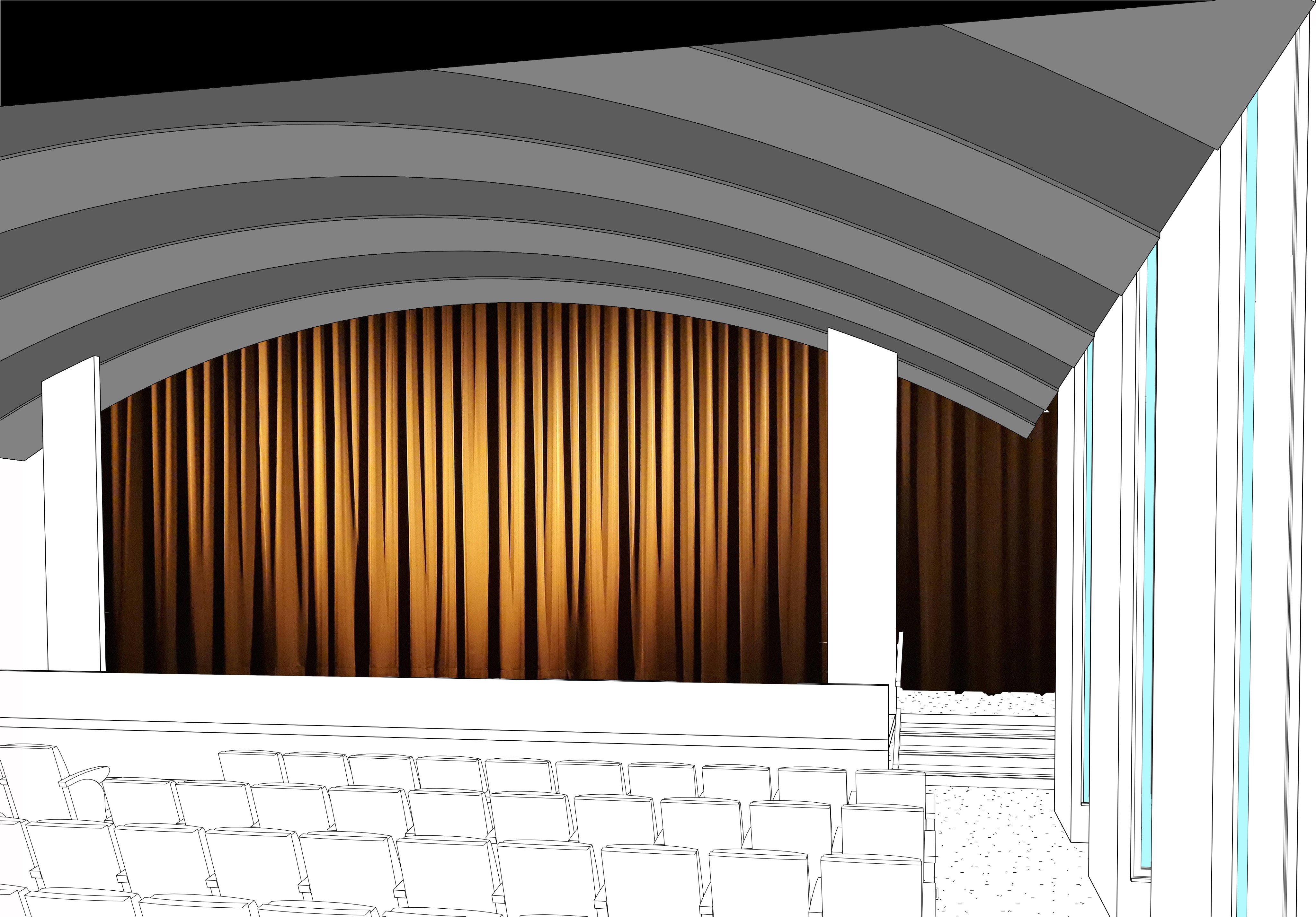 interior shot this is a view of a stage with the curtain drawn with a metal curved ceiling make the curved ceiling a matte metallic finish with light between the sections