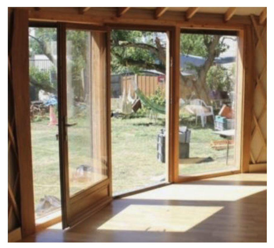 exterior shot show me an outside view of this door on the yurt change the front door to the one in the mood board