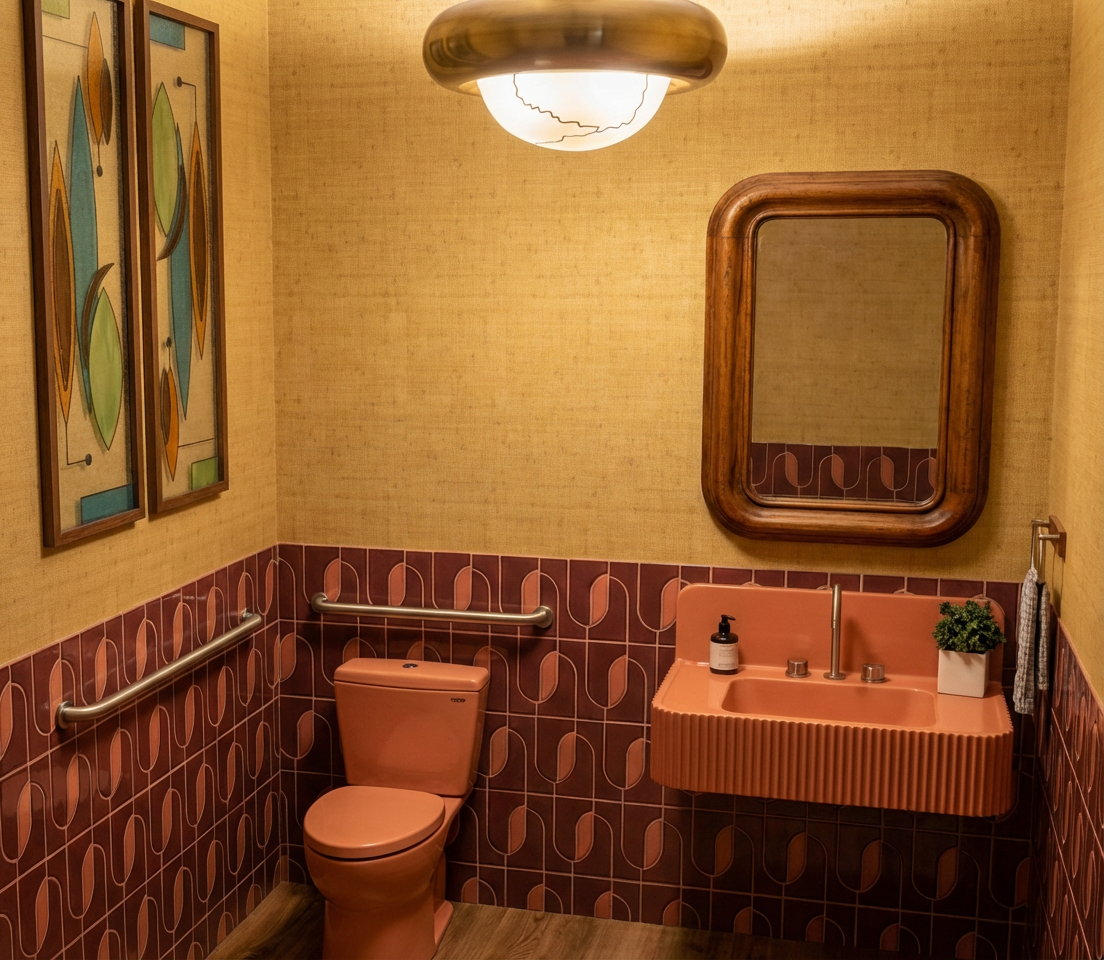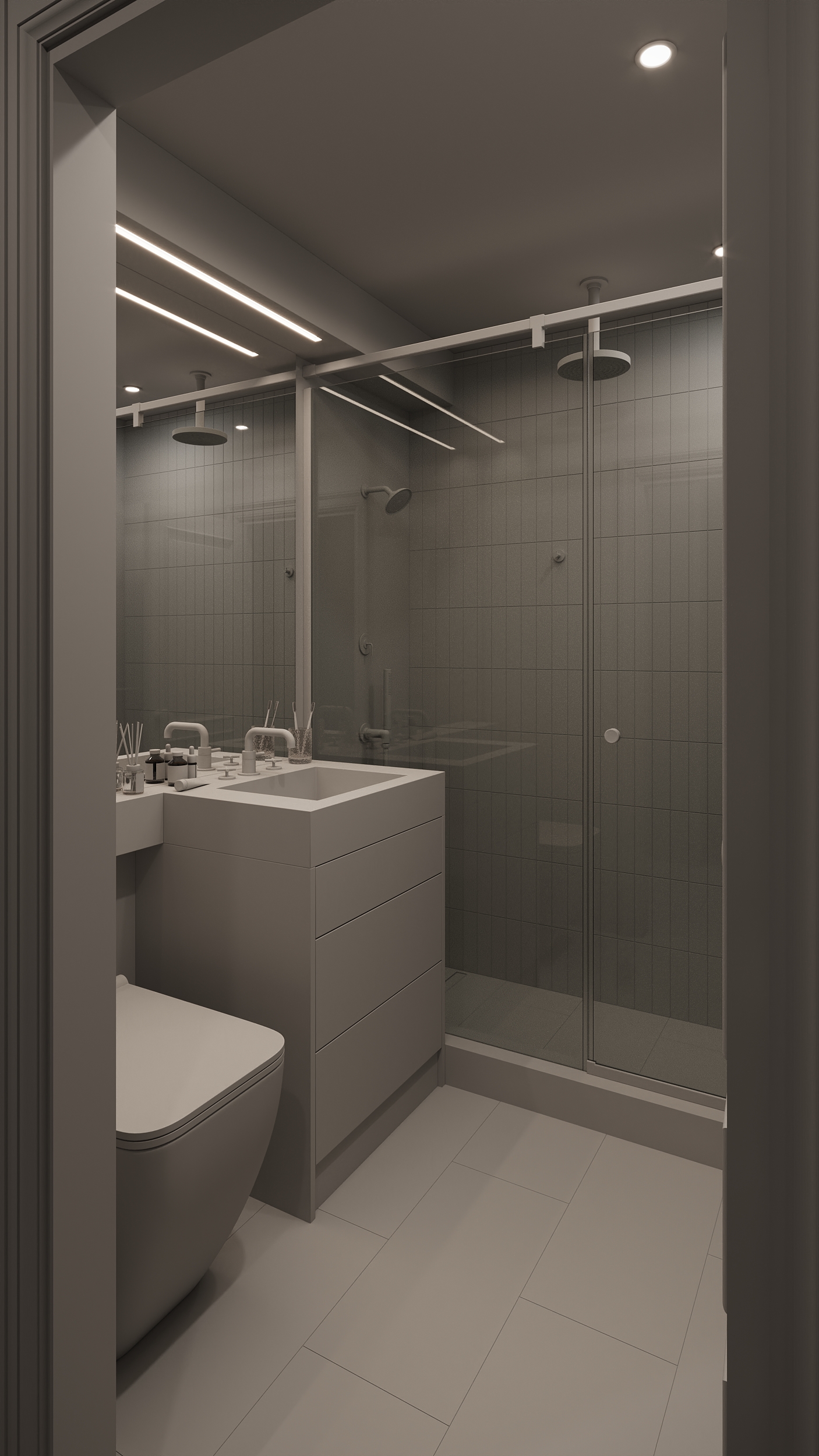 make the shower tile off white ceramic and taupe terrazzo flooring and countertop and white oak vanity without hardware and make the fixtures aged unlacquered brass
