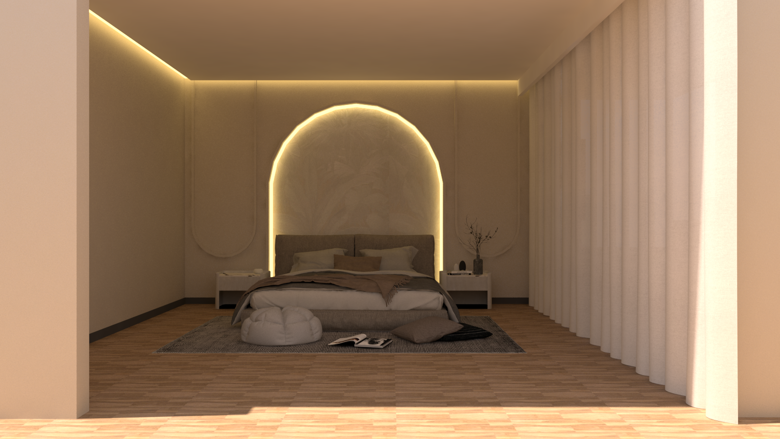 a tranquil modern bedroom with muted earth tones and soft lighting the focal point is a cozy bed with gray and beige bedding accentuated by a glowing arch shaped wall light on both sides of the bed minimalist white nightstands hold small decorative items the floor is a warm wood with a textured rug adding depth hanging above are two pendant lights casting a gentle golden glow sheer white curtains partially drawn back create an intimate atmosphere the overall color palette includes soft beige gentle grays warm wood tones and a subtle hint of gold for a serene sophisticated mood
