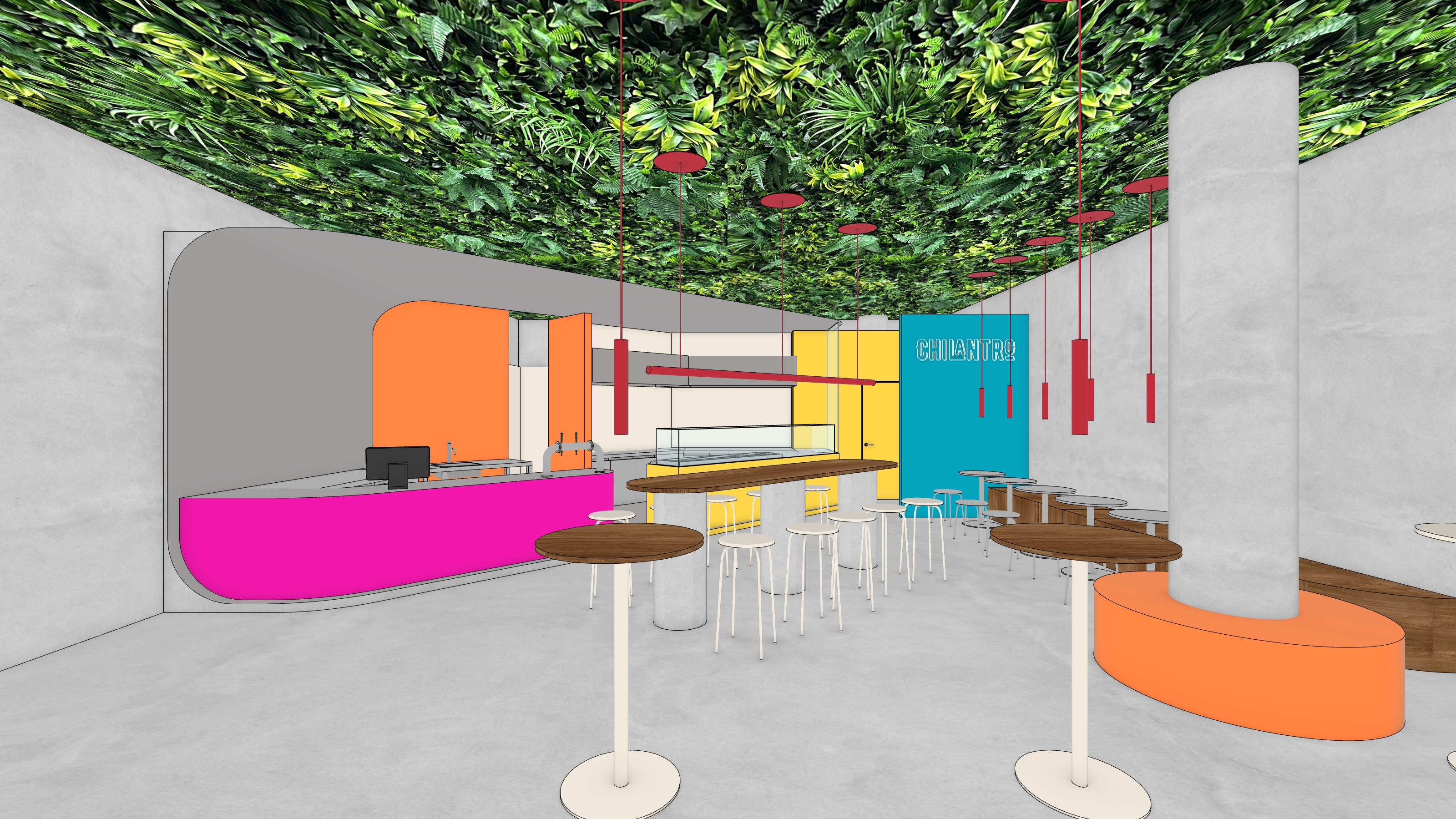 cozy contemporary urban mexican colorful bistro and bar keep original geometry add some interesting but cheap suspended ceiling add cactuses into terracota built planter around the pillar grey volume surrounding counter is stainless steel replace lights and add missing chairs please landscape aspect ratio
