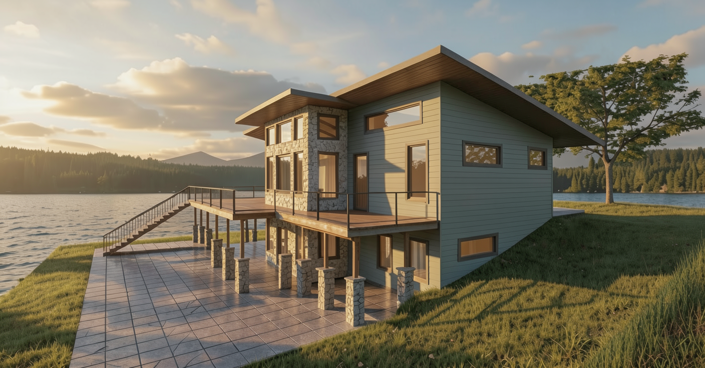 realistic terrace with natural warm daylight pouf and pillow in brown velvet flower pots in dark grey with structure realistic background clear water bottle and glasses table lamp is on keep textures and proportions