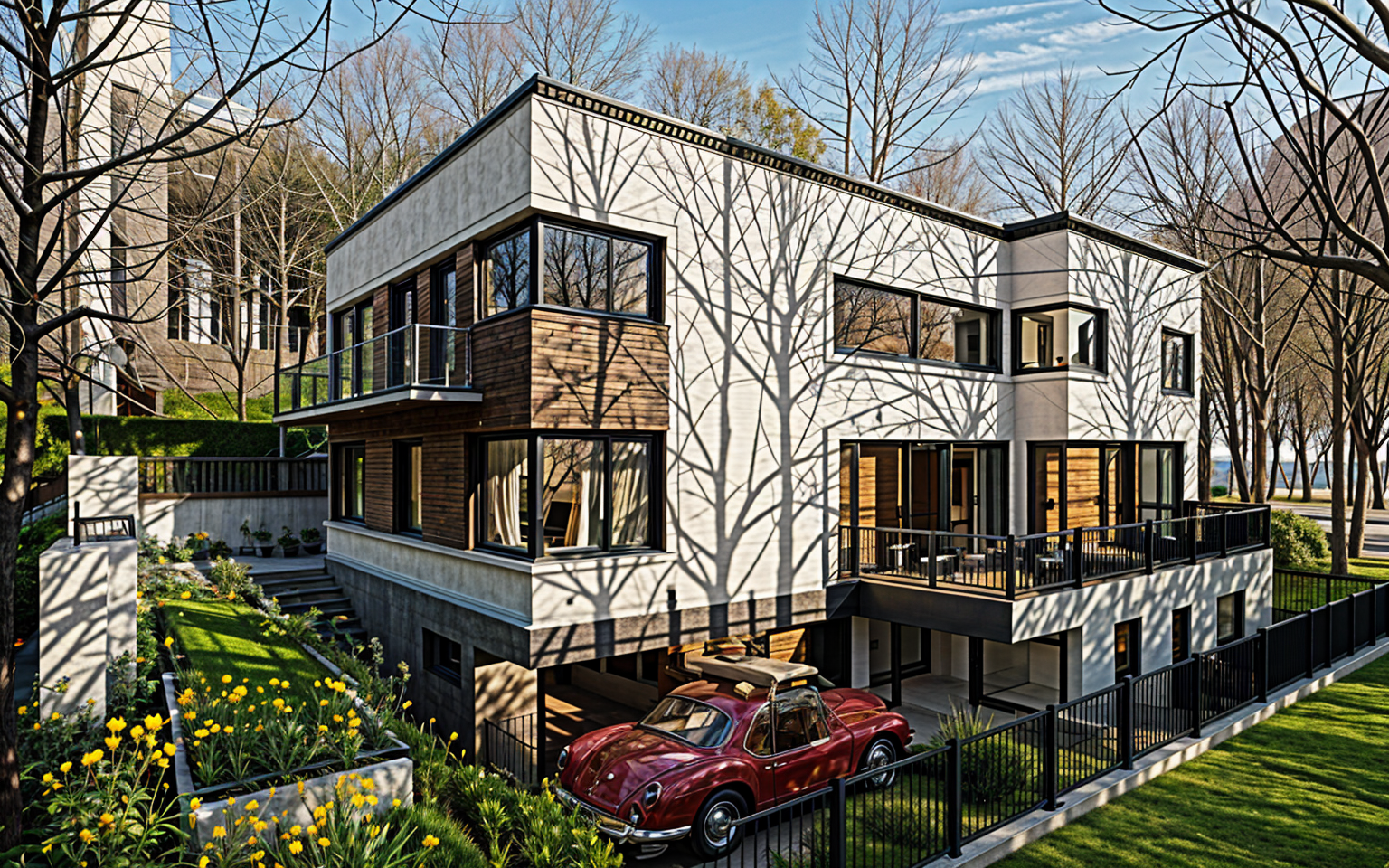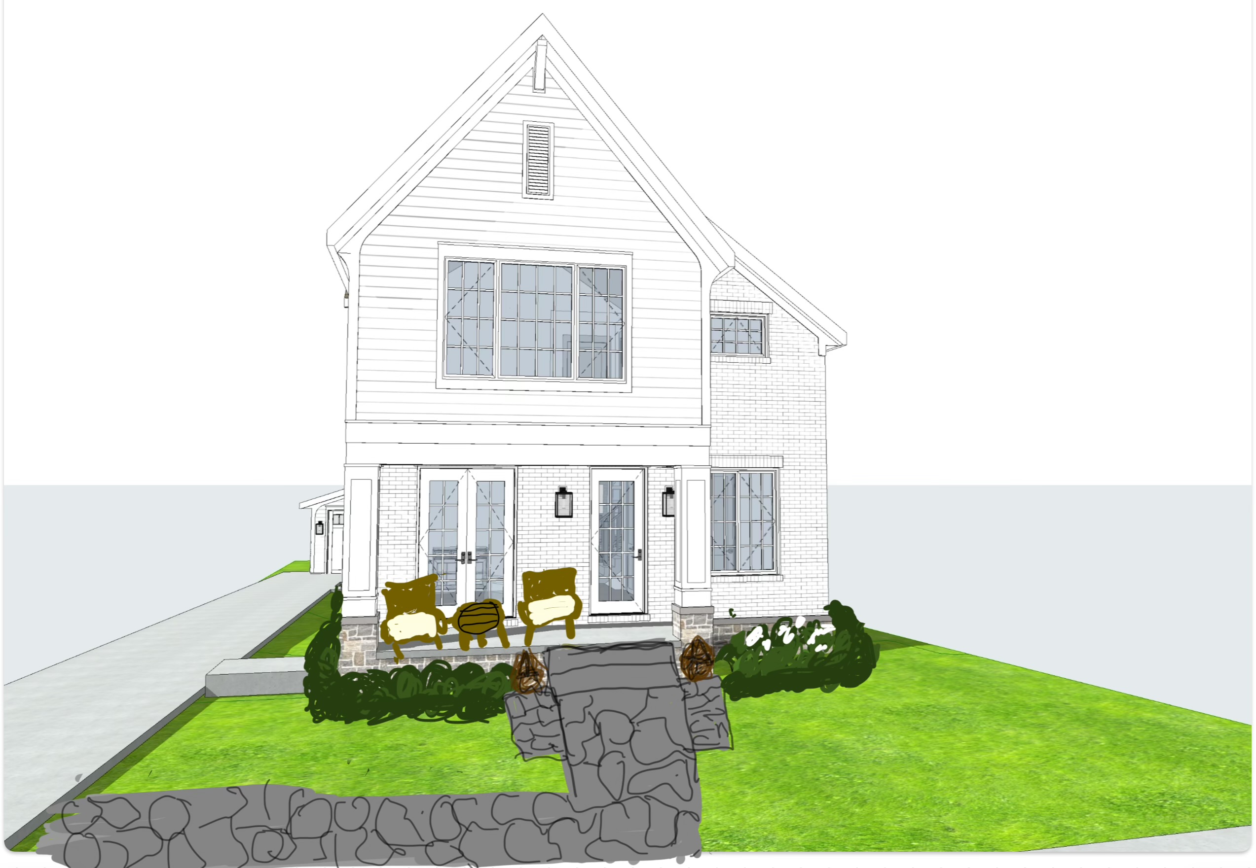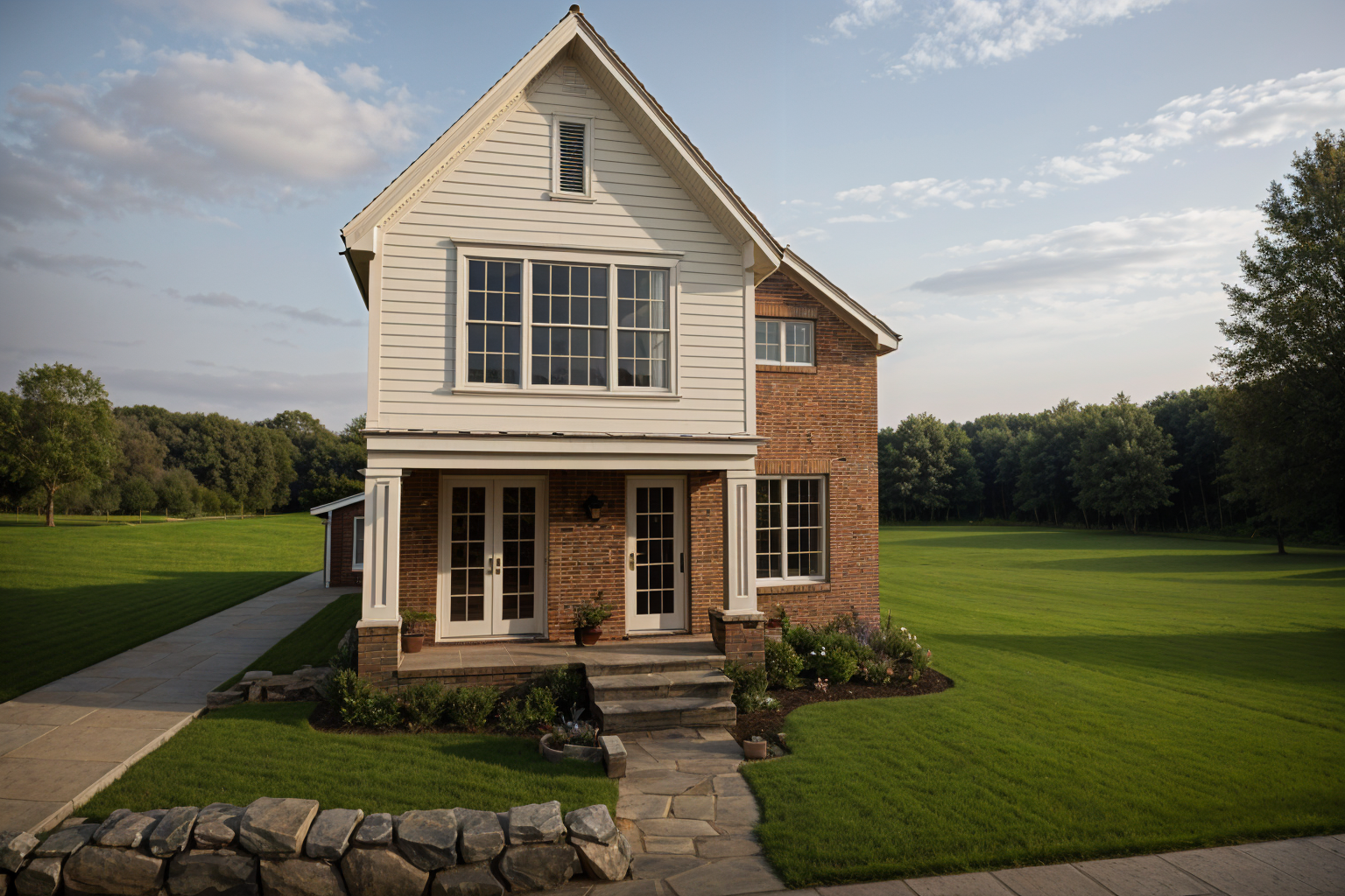 a charming two story house with a steeply pitched roof painted in soft white with subtle gray undertones featuring large elegant window panes adjoining the house is a cozy porch with rustic wooden chairs in a warm honey color complemented by cream cushions surrounding the entrance are lush shrubs in deep green hues and blooming white flowers a pathway leads from the house crafted from smooth gray stone perfectly matching the intricately textured stone wall that frames the foreground the grass is a vibrant lively green lantern style lights add a vintage accent the scene is bathed in the golden glow of a late afternoon sun creating a serene and welcoming atmosphere architecture