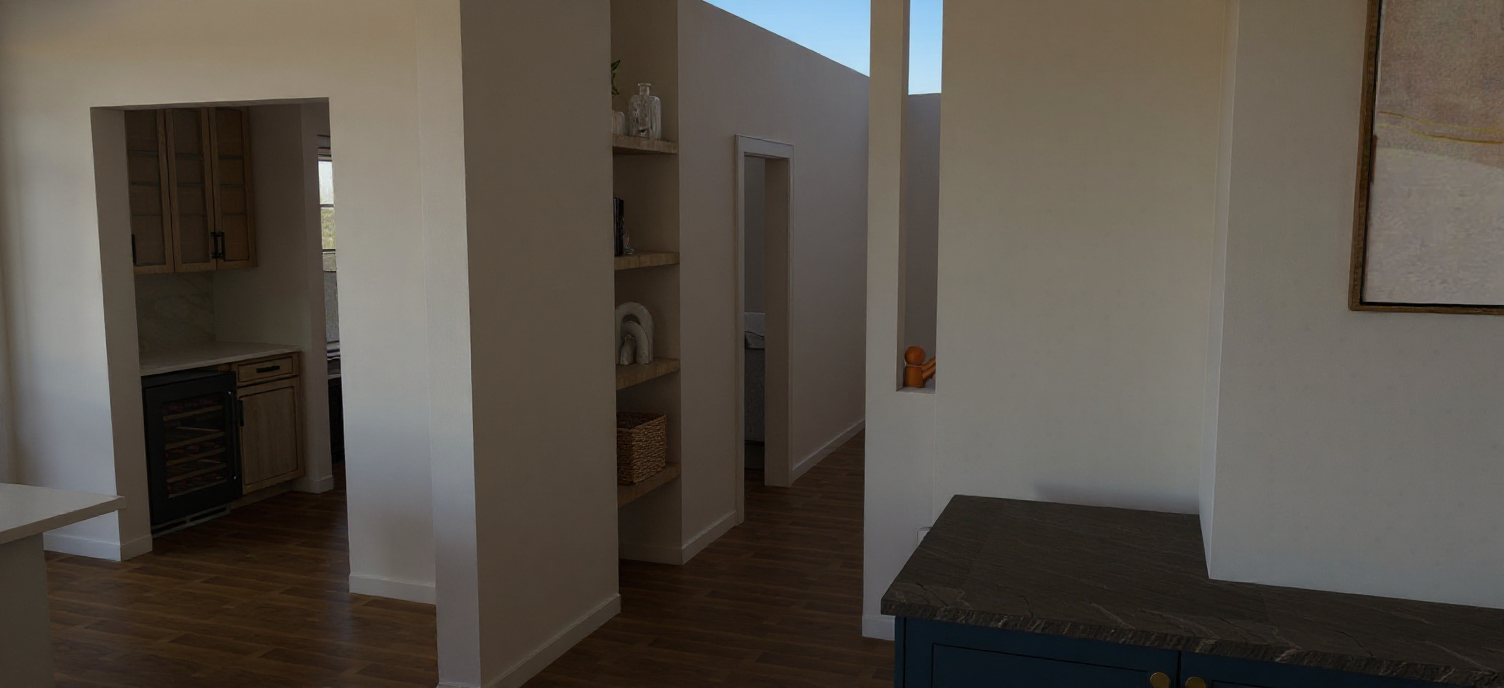 render this interior space exactly as shown without altering the architecture geometry or circulation window with view is terrace and garden the wall behind the jacuzzi with the boards is vegetal wall keep the existing staircase and levels exactly as they are do not add or remove stairs or change the direction of the levels this is a wellness area in a private home create a warm cosy and natural atmosphere with abundant natural light soft shadows and a calm relaxing mood decorate subtly with natural materials like wood and stone and soft neutral tones the ceiling openings should allow daylight to flood the area use realistic textures and materials but do not change the architectural layout save this prompt