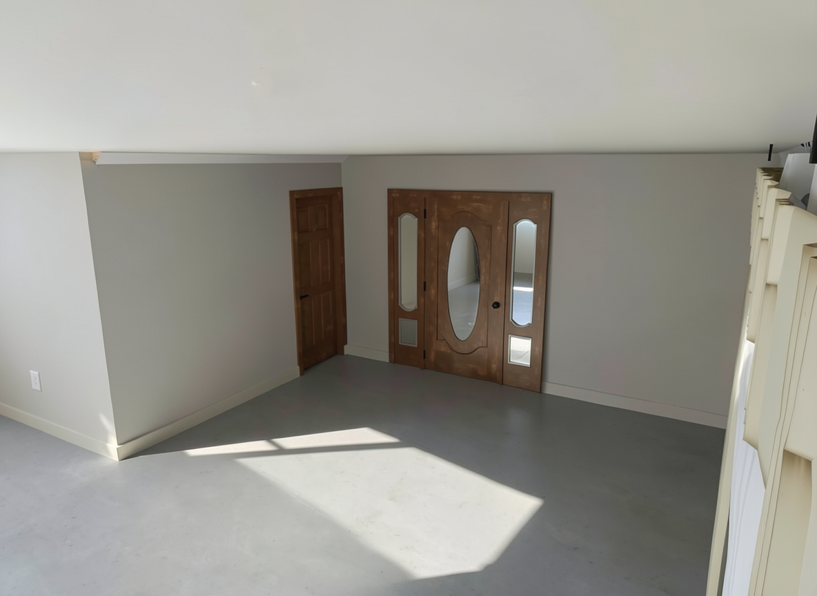 enhance this image without changing the architecture add lighting a disco ball hanging from the center and low sunset golden hour lighting