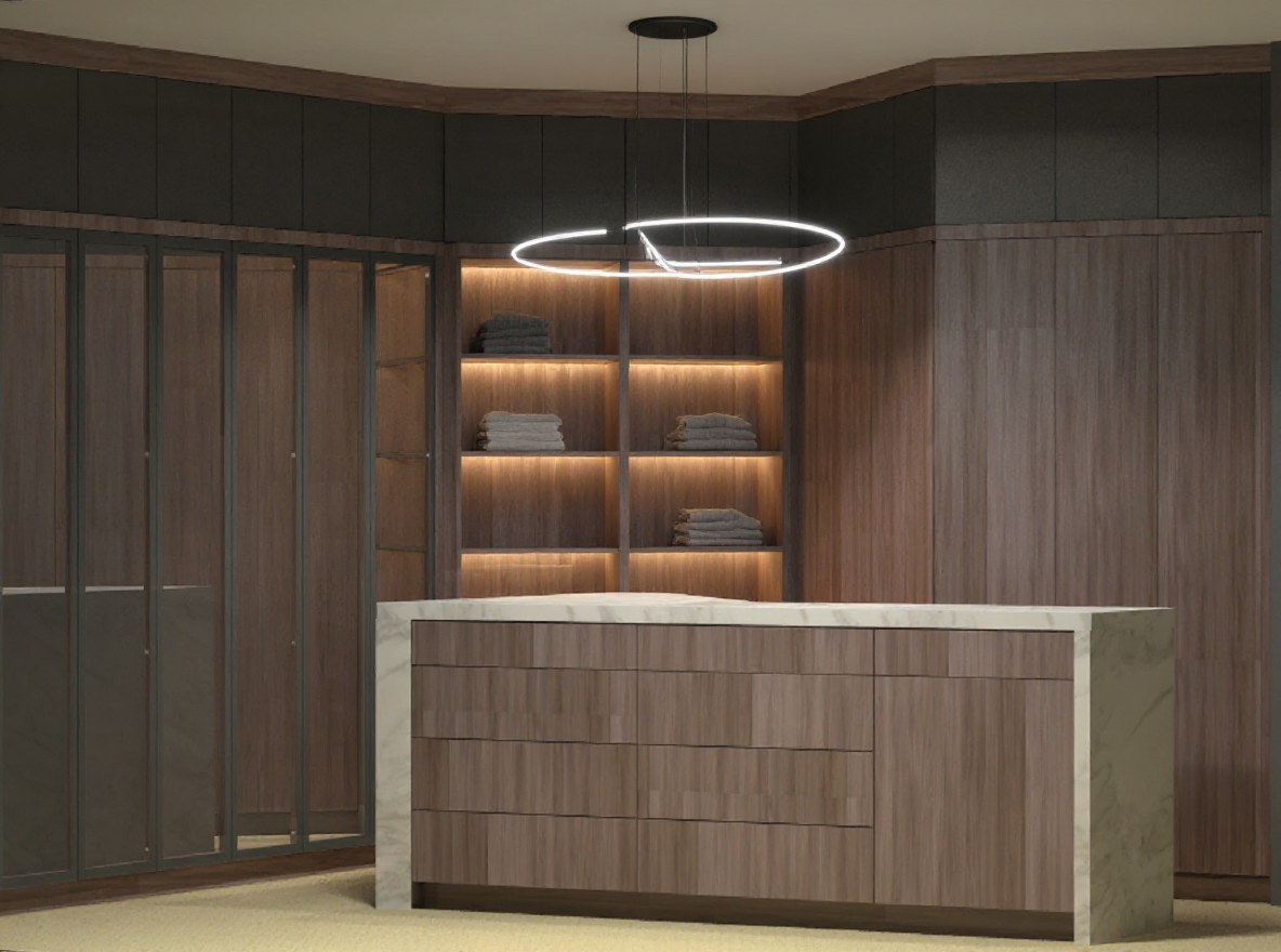 in the open shelving section i want you do add some vertical leds and some folded clothes replace the 2 white boxes for stacked washer and dryer