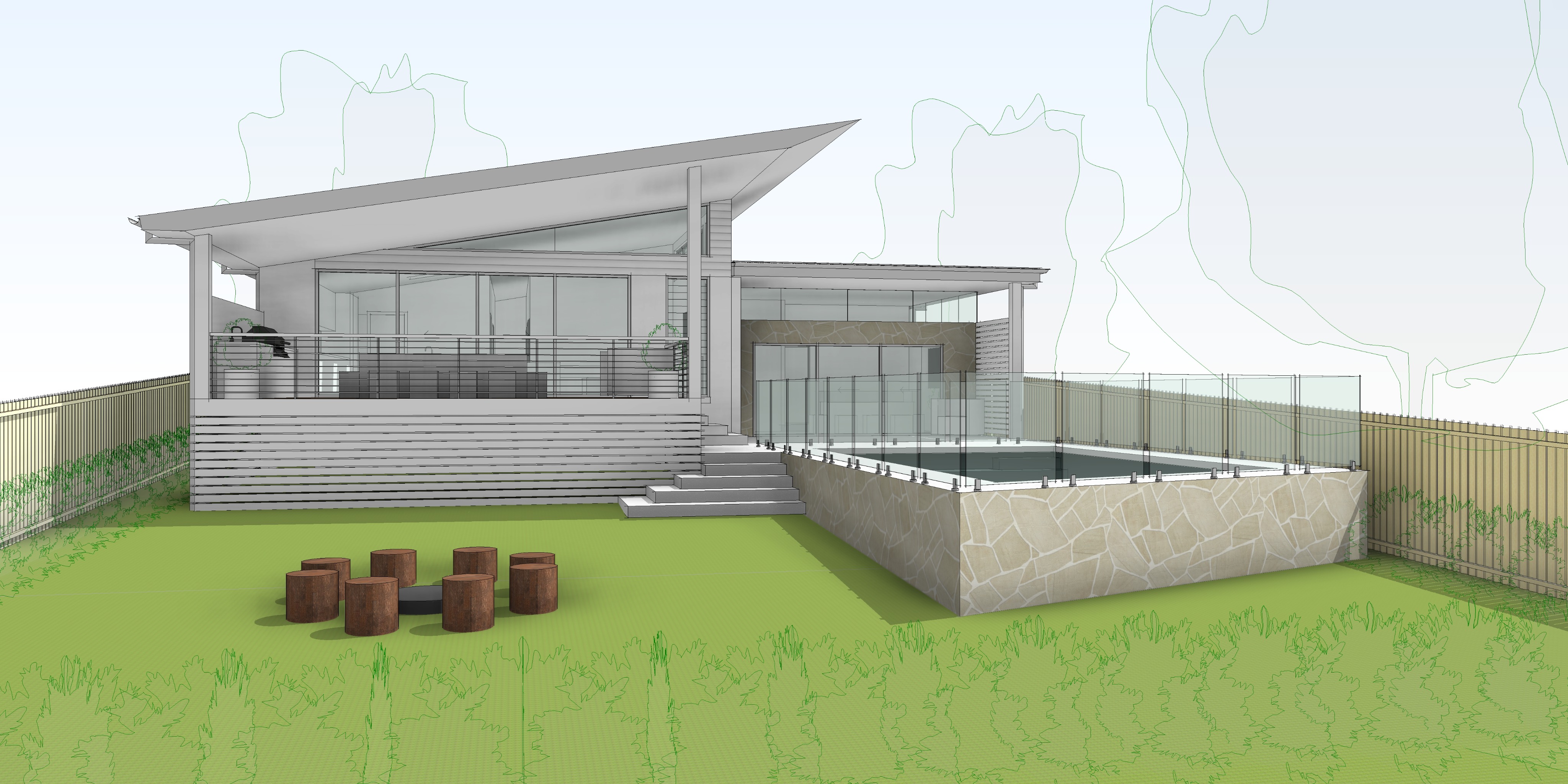 render a photorealistic 3d perspective of this house near sydney reference the current material style and enhance them white metal roof linea fibre cement cladding and sandstone walls keep model geometry the same windows doors roof walls garage door pavement driveway make a lush vegetation that looks native to australia do not change the view only enhance the current materials and make the landscape nicer vegetation detailed textures in the grass and glass reflections and a vibrant clear sky with light atmospheric depth render in hyper realistic architectural visualization quality 8k resolution