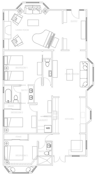 convert this floor plan into a realistic isometric 3d view of a full house show the space from an elevated angle with furniture walls and details visible cottage style single family home hardwood floors tile for bathrooms and quartz countertop for kitchen closet space for every bedroom use light colors with a traditional style use the same furniture as shows on the plan do not change the orientation of the floorplan