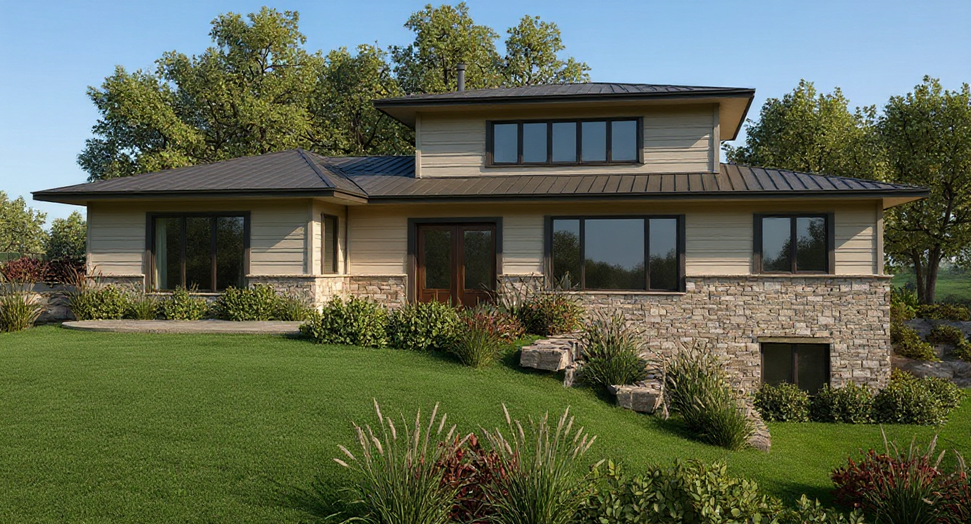 make this look real smooth out the topography show real plants in the foreground and some trees in the background stay true to the building geometry window placement etc