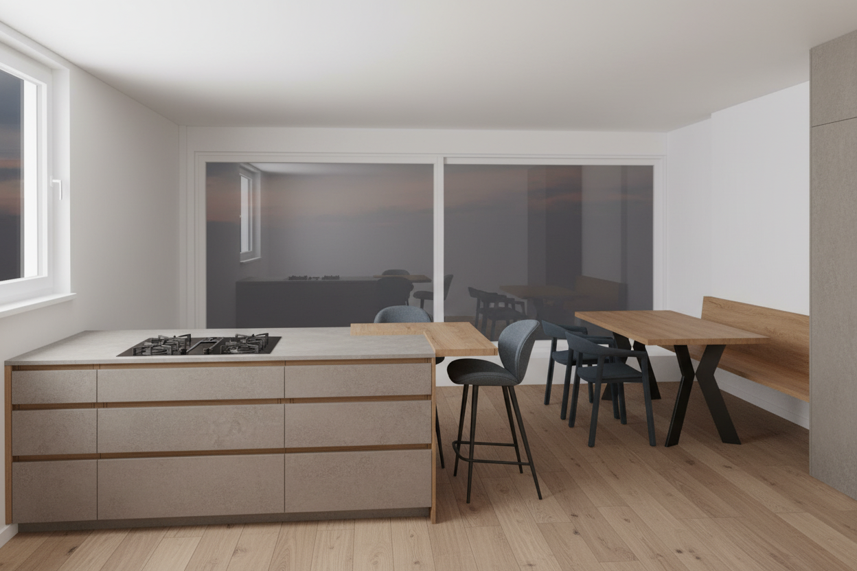 flawless dull oak flooring roteted 90 degrees wall and ceiling white painted cabinets fundermax 0071 fresko ap countertop dekton marina silvercoast without handls background over the sink in oak oven in black boraxbo egde on the counter in oak cookingpanel bora classic with gas cabinets under the counter fundermax 0071 fresko whitout handls the visible outer surfaces of that structural box in fundermax 0071 fresko cabinets over the sink in fundermax 0071 fresko the visible outer surfaces right on the counterstool in fundermax 0071 fresko
