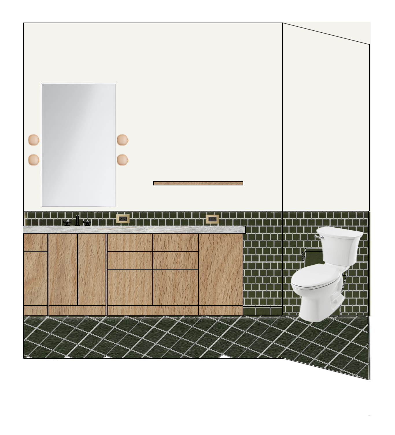 photorealistic interior bathroom vanity elevation tan drywall spherical sconces flanking a cut mirror brass cabinet hardware brass faucet toilet on wall at 45 degree angle sink and cabinet underneath stick out from the rest of the cabinetry about 8 inches matte floor tile glossy wall tile