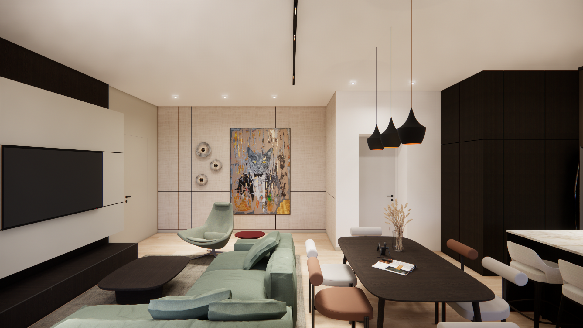 change the color of the sofa into creame color more natural light the dining chair shoud be the same color like ther are on the render