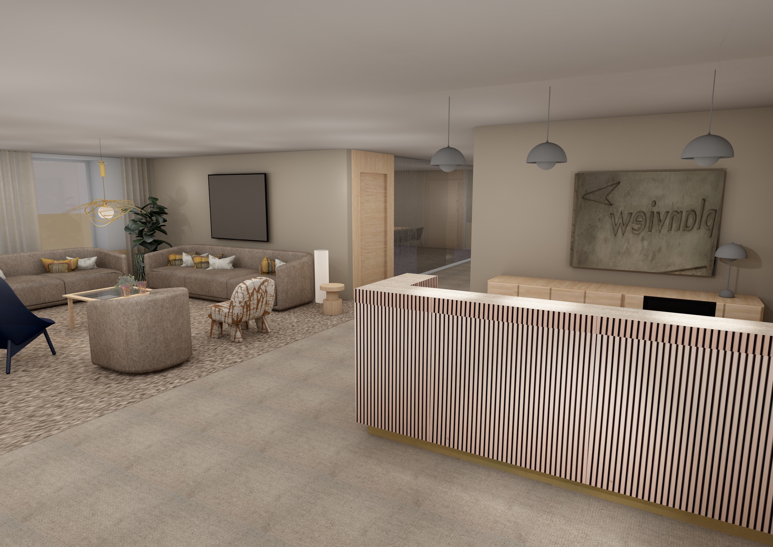 make it more photo realistic and nice put a large bouquet of flowers on the storage behind the front desk to the right create some mice ambience light in the lounge it shuld still be a dautime piqture make the pictue mich brighter this is too dark more lights in the lounge by the sofas