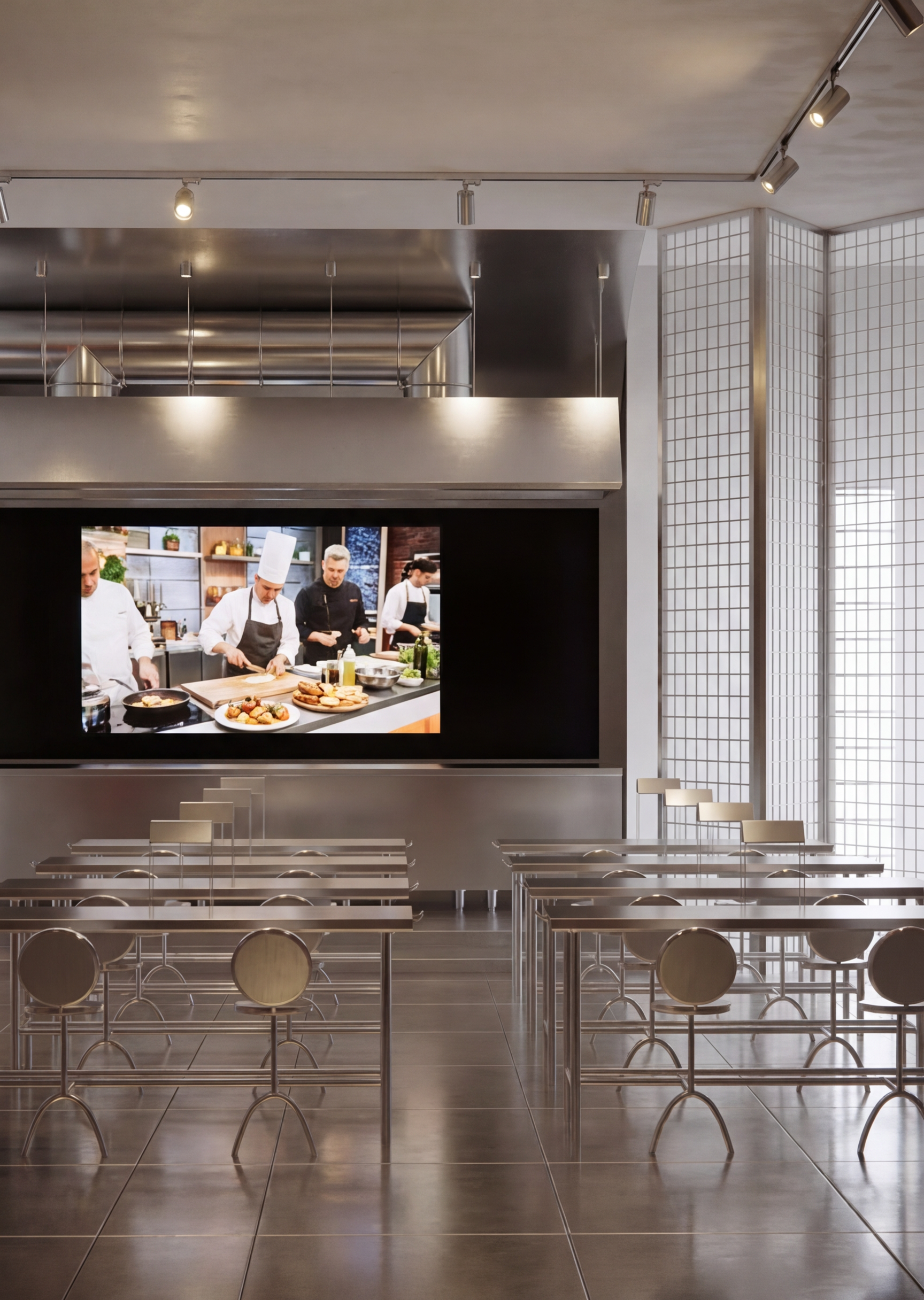 industrial offices and seamstress workshop upper interior view grey floor cocrete columns concrete walls black iron framed glass doors