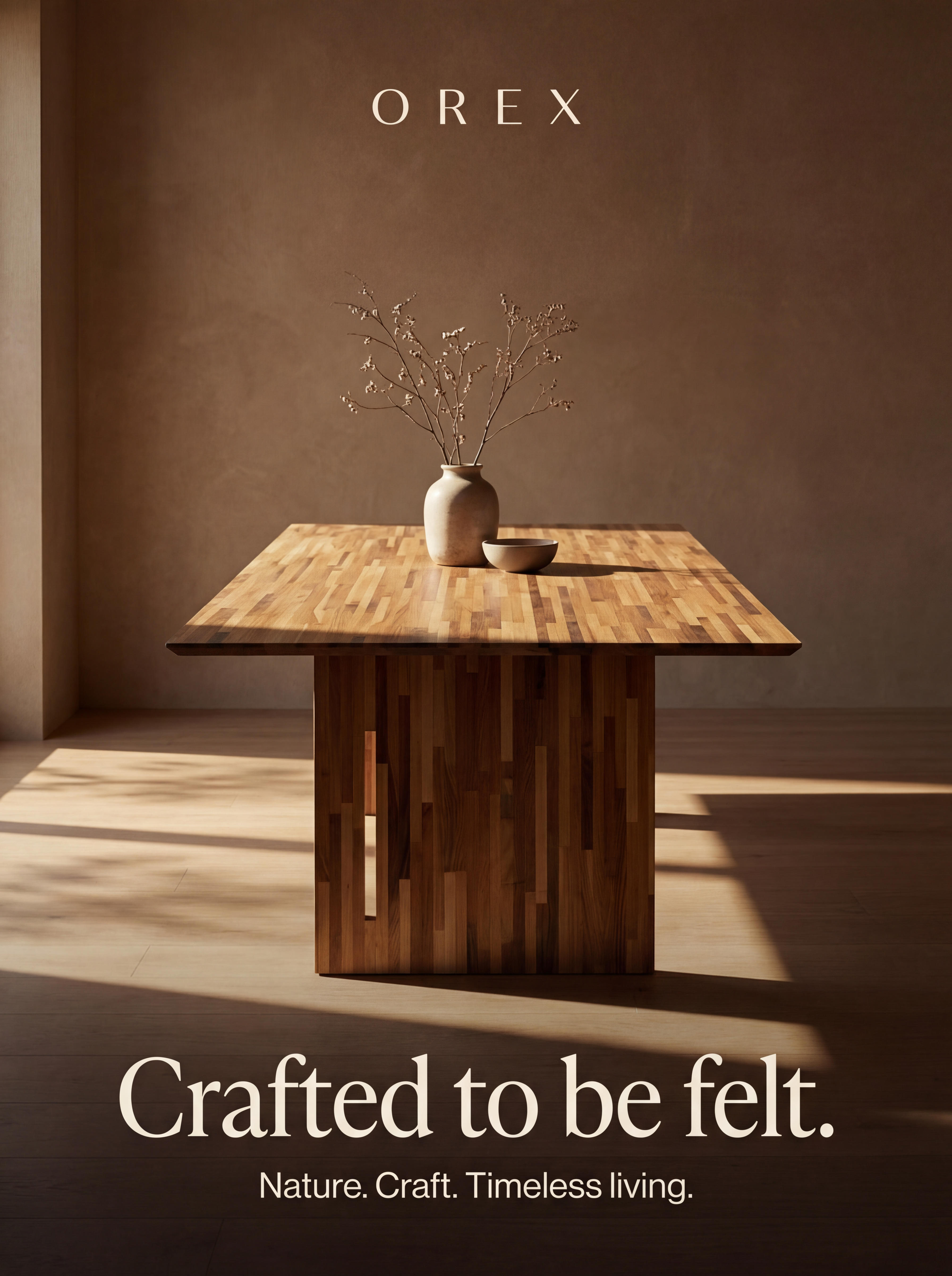 transform this scene into a warm moody high end editorial product render keep the table exactly as it is same geometry same thickness same wood texture same proportions do not redesign or modify the table in any way place the table in a minimalist earthy interior with a warm brown textured wall add strong directional sunlight coming from the left creating long soft shadows across the table and wall add a ceramic vase with delicate branches and a small bowl on the table styled minimally and elegantly use a cinematic soft luxury lighting atmosphere with deep shadows and warm tones camera angle slightly elevated front perspective centered composition similar to a high end furniture campaign add refined typography orex centered at the top minimal spaced lettering crafted to be felt large elegant serif at bottom nature craft timeless living smaller subtitle below