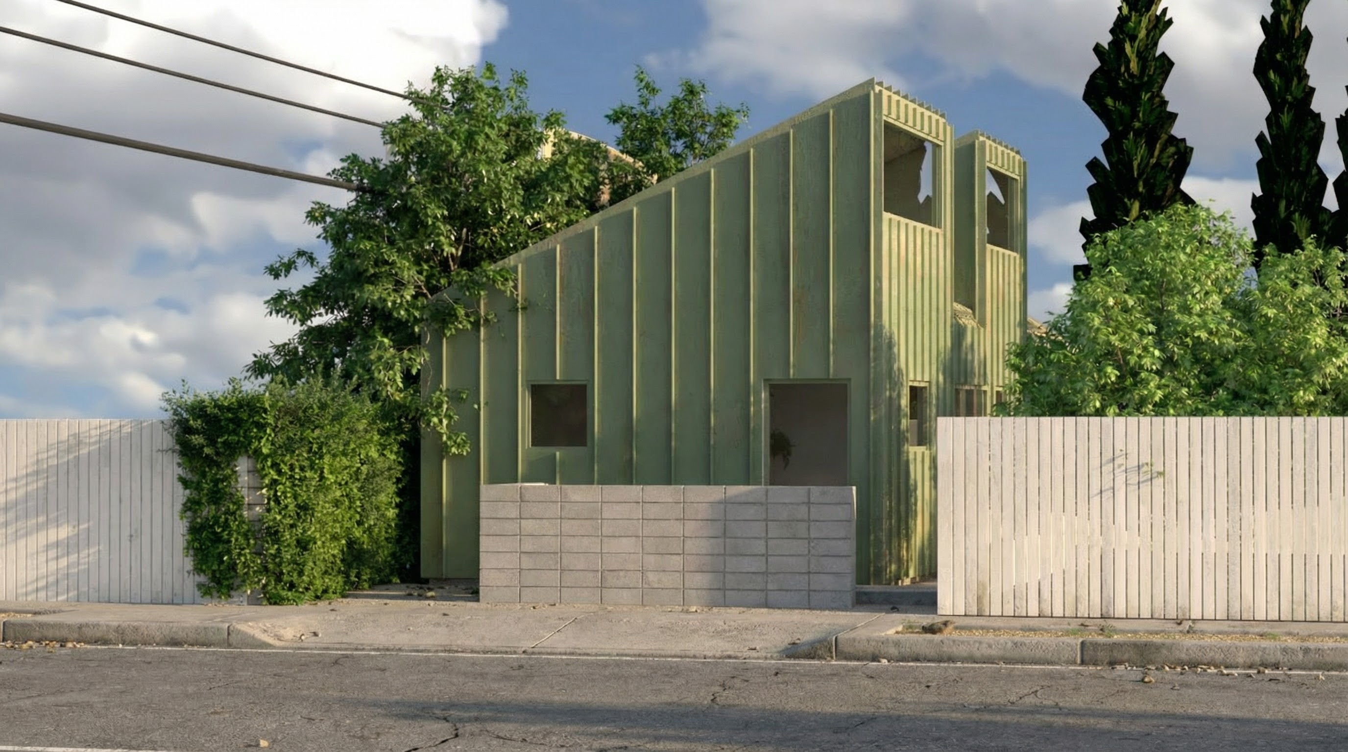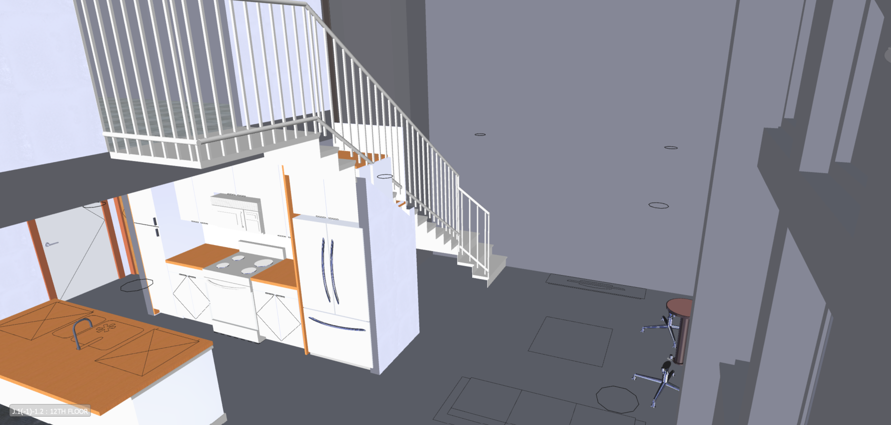 render with medium oak flooring blue base cabinets in the kitchen blue upper cabinet above the fridge medium oak upper cabinets above the stove walls white base molding white stair railing turrets black and hand rail in medium oak