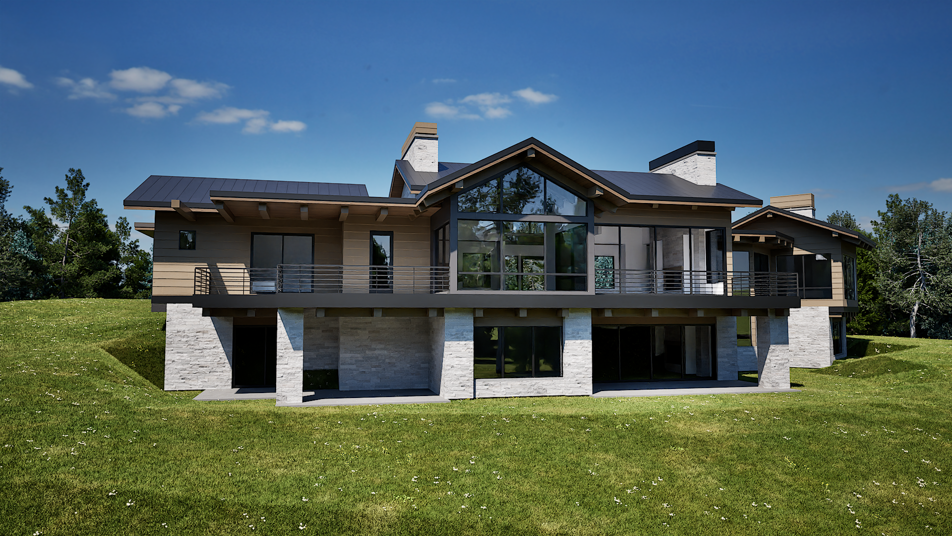a mountain modern with brown horizontal wood siding black standing seam metal roofing the stone is creamy white clean cut dry stacked stone retain the exact structure window arrangement patio columns balcony chimney rooflines foundation height and proportions exactly as shown in the reference image surround the property with a lush dense forest of tall mixed evergreens and hardwoods make the environment a bright sunny day with a few fluffy clouds add plants and landscaping around the exterior to add some color create ultra realistic lighting crisp shadows detailed textures in the wood siding and glass reflections depth render in hyper realistic architectural visualization quality 4k resolution