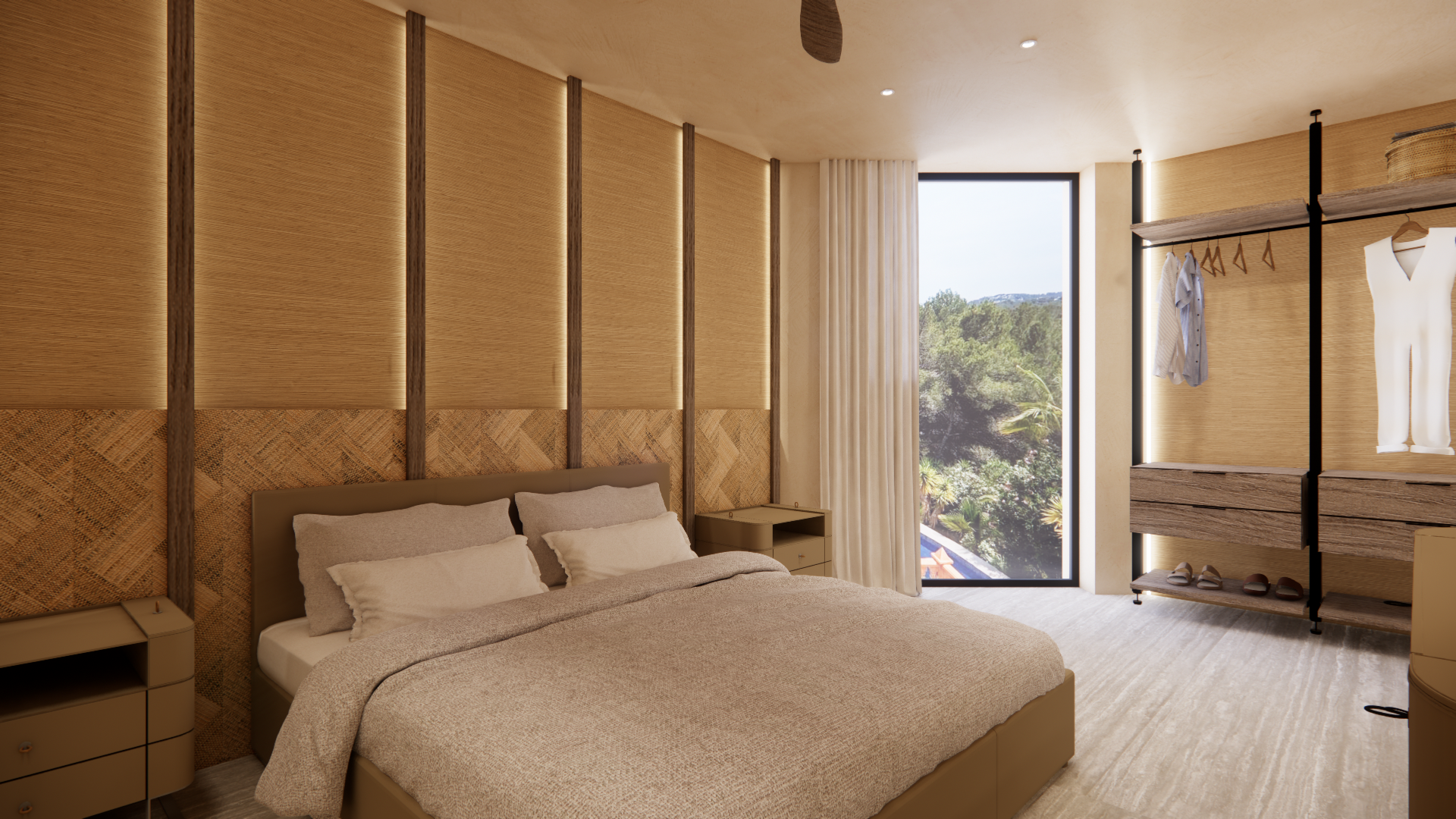 transform this 3d render into a hyper realistic professional architectural photograph while preserving exactly all original materials textures colors and proportions critical material fidelity maintain 100 the original travertine natural stone flooring same tone veins finish maintain exactly the natural wood ceiling fan same color grain and finish do not change any wood stone concrete fabric or metal tone do not alter the color palette do not modify geometry or camera angle only convert render look into real photography look lighting logic based on visible windows if windows are visible strong natural sunlight entering only through existing openings defined shadows from window frames sun patches on floor and walls blue vibrant sky visible outside natural contrast between sunlit and shaded areas if no windows visible bright diffused daylight no direct sun beams uniform clear illumination 5500 6500k photographic settings canon eos r5 24 70mm lens f 8 iso 100 1 250s mid afternoon daylight realism enhancement add subtle micro imperfections barely visible realistic reflections on glass and metals natural fabric folds subtle ambient occlusion high dynamic range architectural digest style add minimal elegant decoration books organic objects natural plants respecting the original palette one person naturally integrated in the scene well dressed neutral clothing interacting calmly with the space sitting on the bed or walking near the window the person must feel candid and realistic not posed final result a premium architectural magazine photograph indistinguishable from a real professional photo with total material fidelity and physically correct lighting