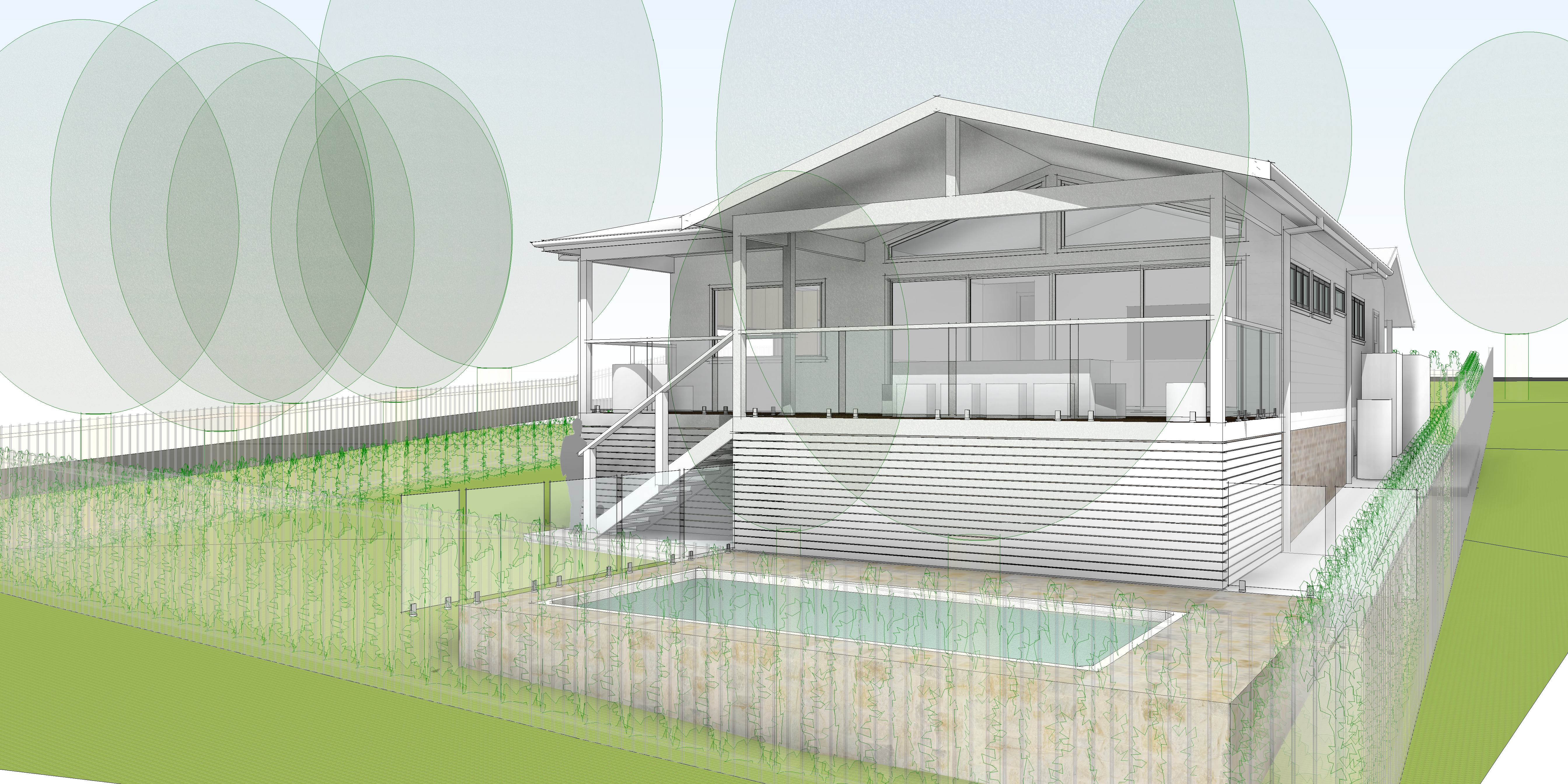 render a photorealistic 3d perspective of this house in a australia reference the current material style just enhance them white standing seam metal roof horizontal fibre cement cladding keep model geometry the same windows doors roof walls garage door pavement driveway make a lush vegetation that looks native to australia do not change the view only enhance the current materials and make the landscape nicer vegetation detailed textures in the water and glass reflections and a vibrant clear sky with light atmospheric depth render in hyper realistic architectural visualization quality 8k resolution