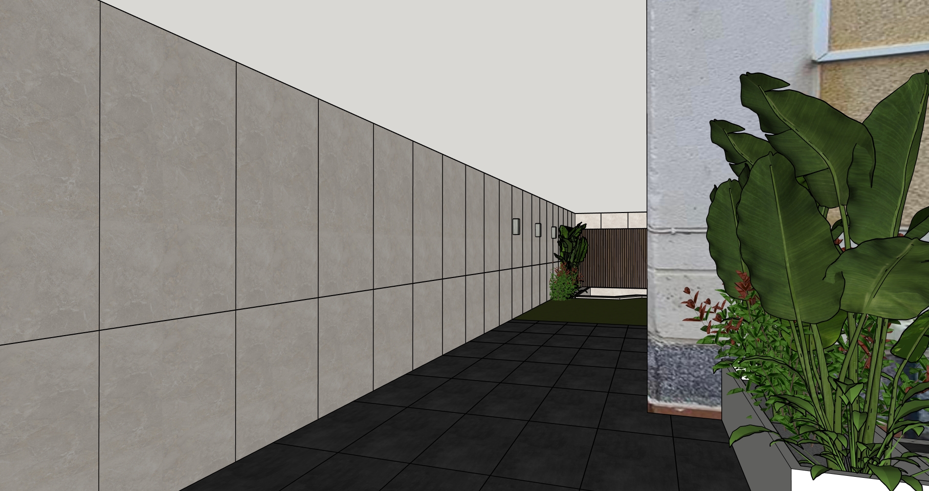 crea una imagen fotorealista a partir de este sketchup es un exterior tenlo en cuenta que no se vea tanto la union entre las baldosas de la pared alimina las plantas que han aparecido a la izquierda pegadas a la pared elimina las plantas de la izquierda