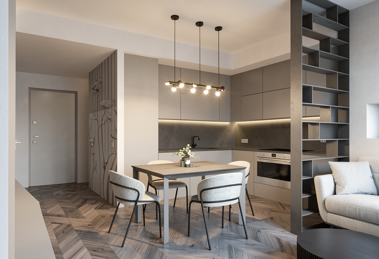 make a rendering from this view with glass partitians in the arches the one in the middle has no door the other ones has the glass partitians has grey window bars lite the window in the top behind the glasspartitians is an office with white desks fronting each other people are passing and looks happy