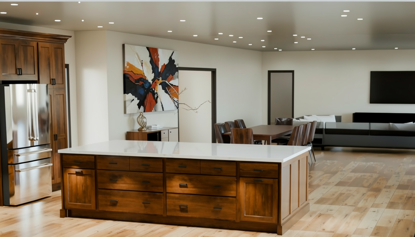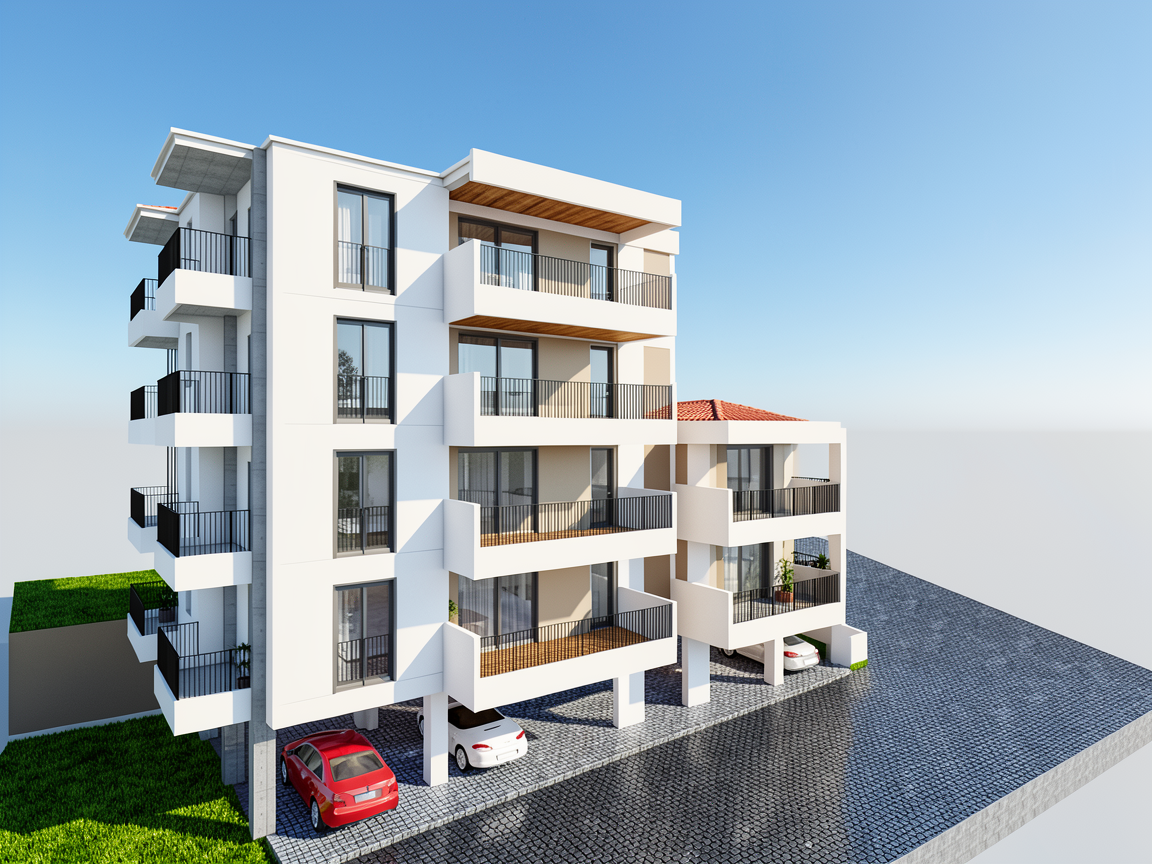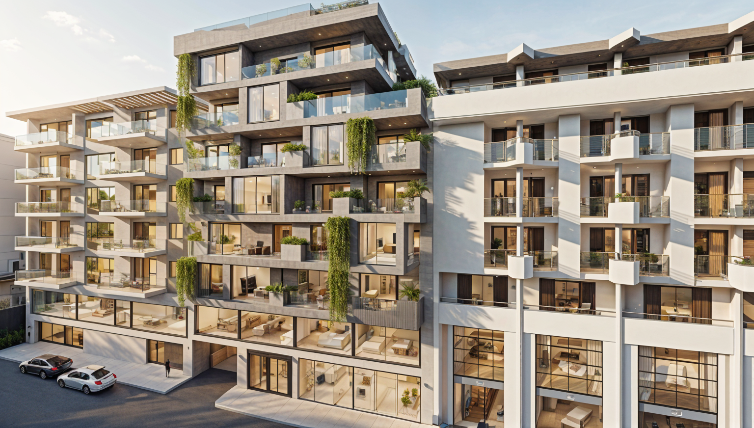 create realisitc render with a boutique in the bottom floor of the middle building the other buildings should be the same