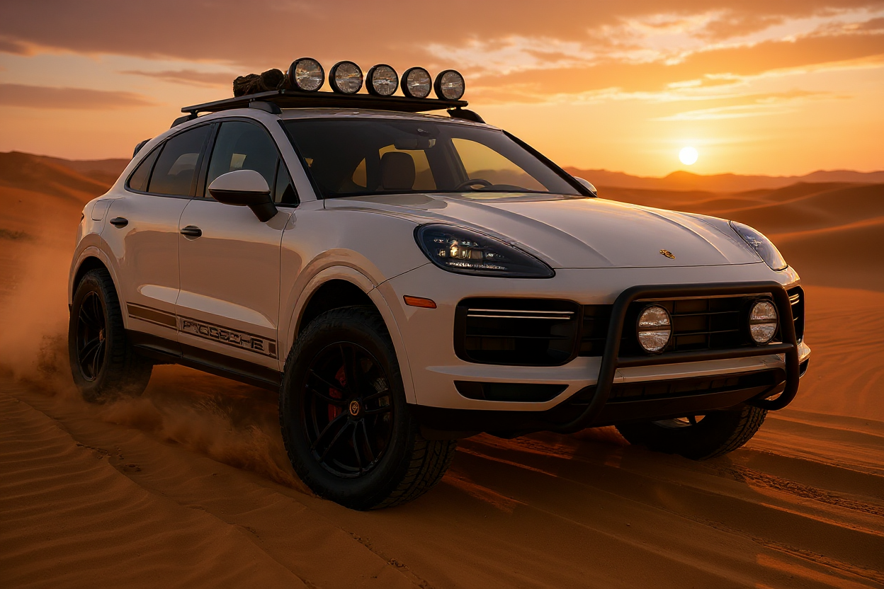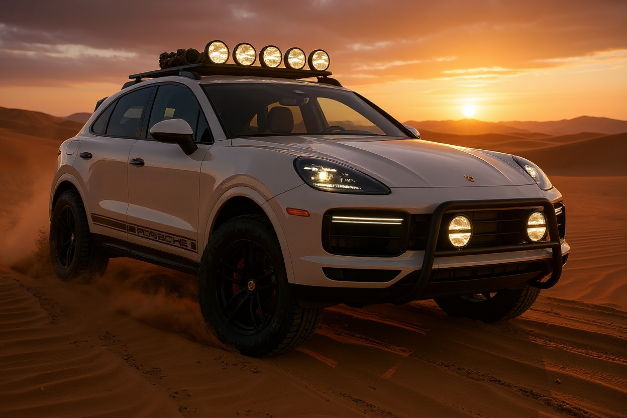 cover the vehicle in dirt woth porsche side racing stripes with all lights turned on remove everything on the roof except the lights and add a medium size offroad spare tire and offroad storage on roof change background to baja california trail with sun setting with heavy sand storm