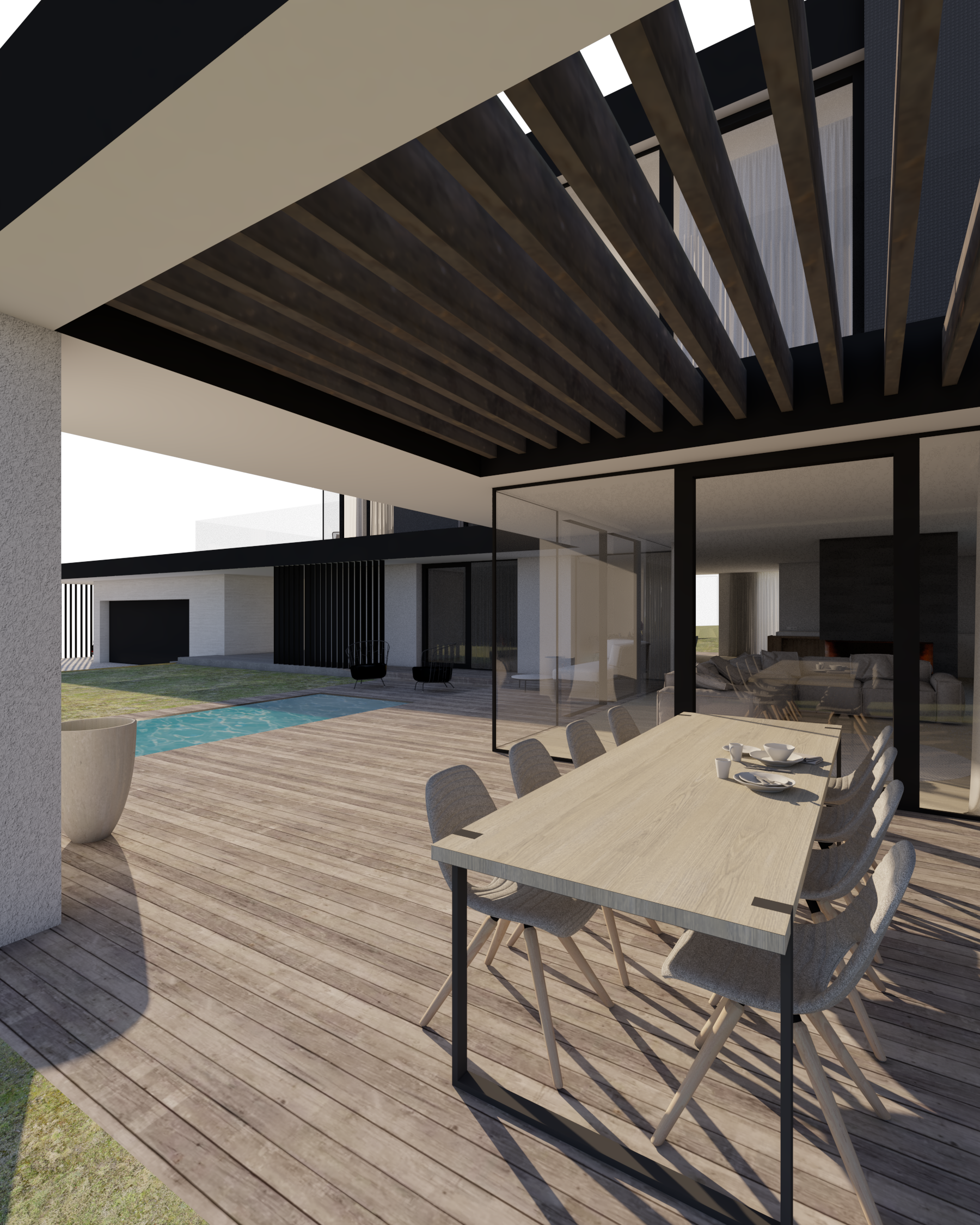precise photorealistic visualization of the exterior of a residential house keep all materials and do not change them glass railings garden grass and trees clouds winter gray black parts sheet metal windows glass