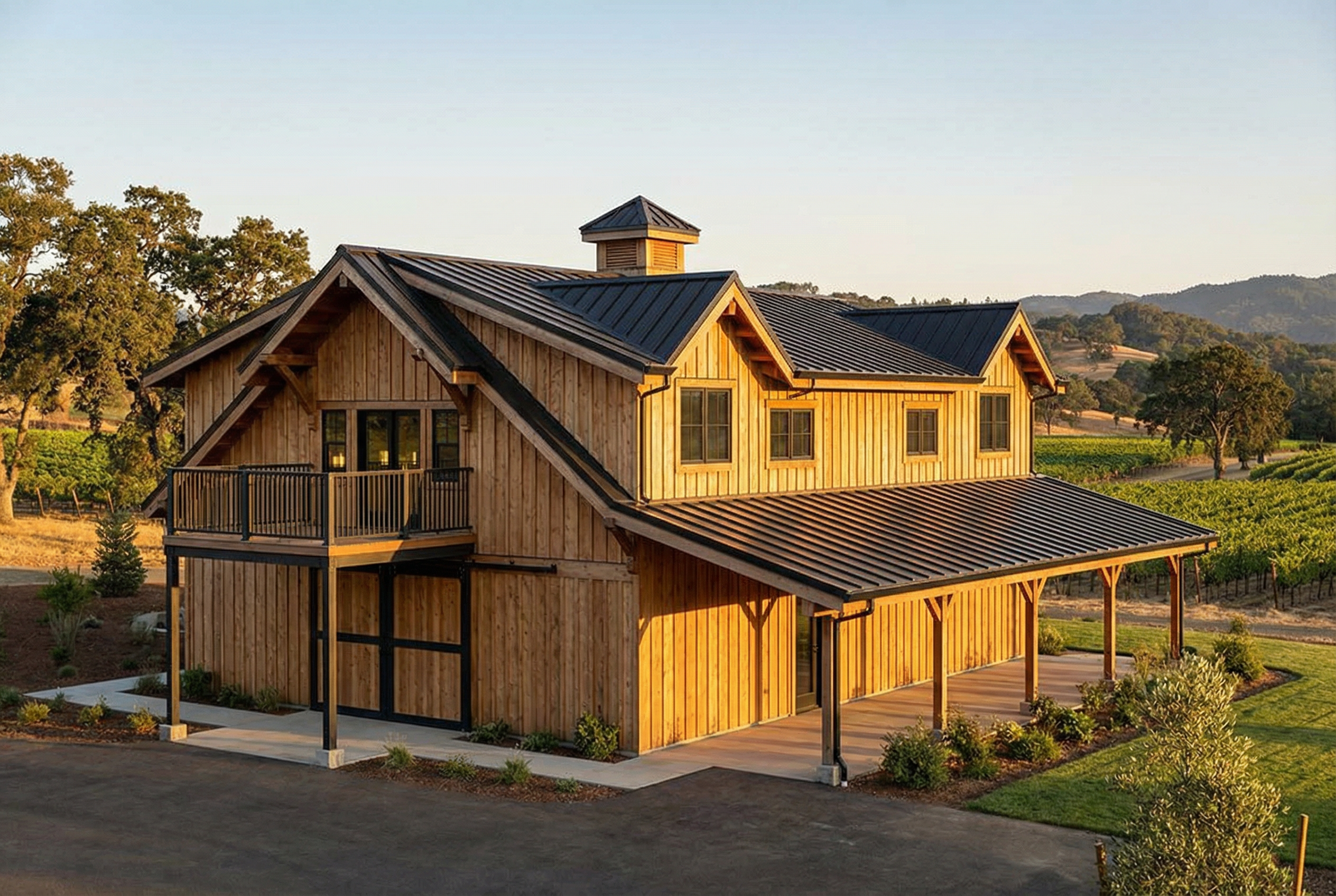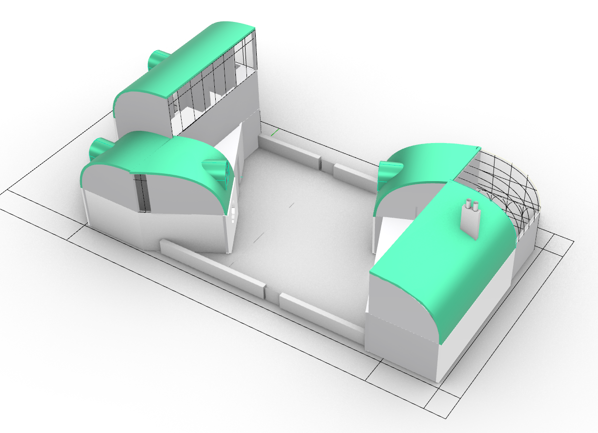 modernist exterior shot the roof is copper the walls are white plaster the window sills are black iron the entire ground is grass architecture