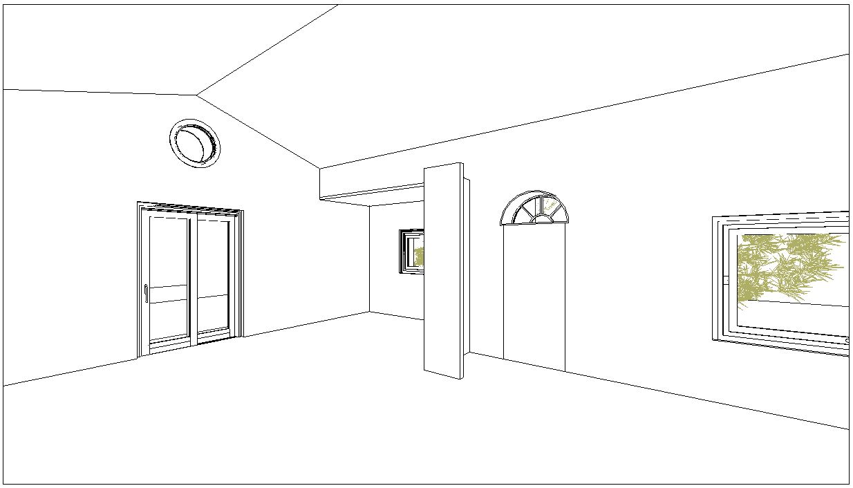 arreda l interno con una cucina moderna con penisola appoggiata tra la portafinestra e la finestrina sul lato sinistro dell ambiente poi aggiungere un tavolo tipo saarinen posizionato nel punto di vista dentro il soggiorno di questa villa con parquet in legno color noce con posa a correre intonaci color avorio chiaro e tetto in legno con travi in legno e assito scuri considerare le falde a 2 acque come nell immagine fai illuminazione moderna anche usando strip led