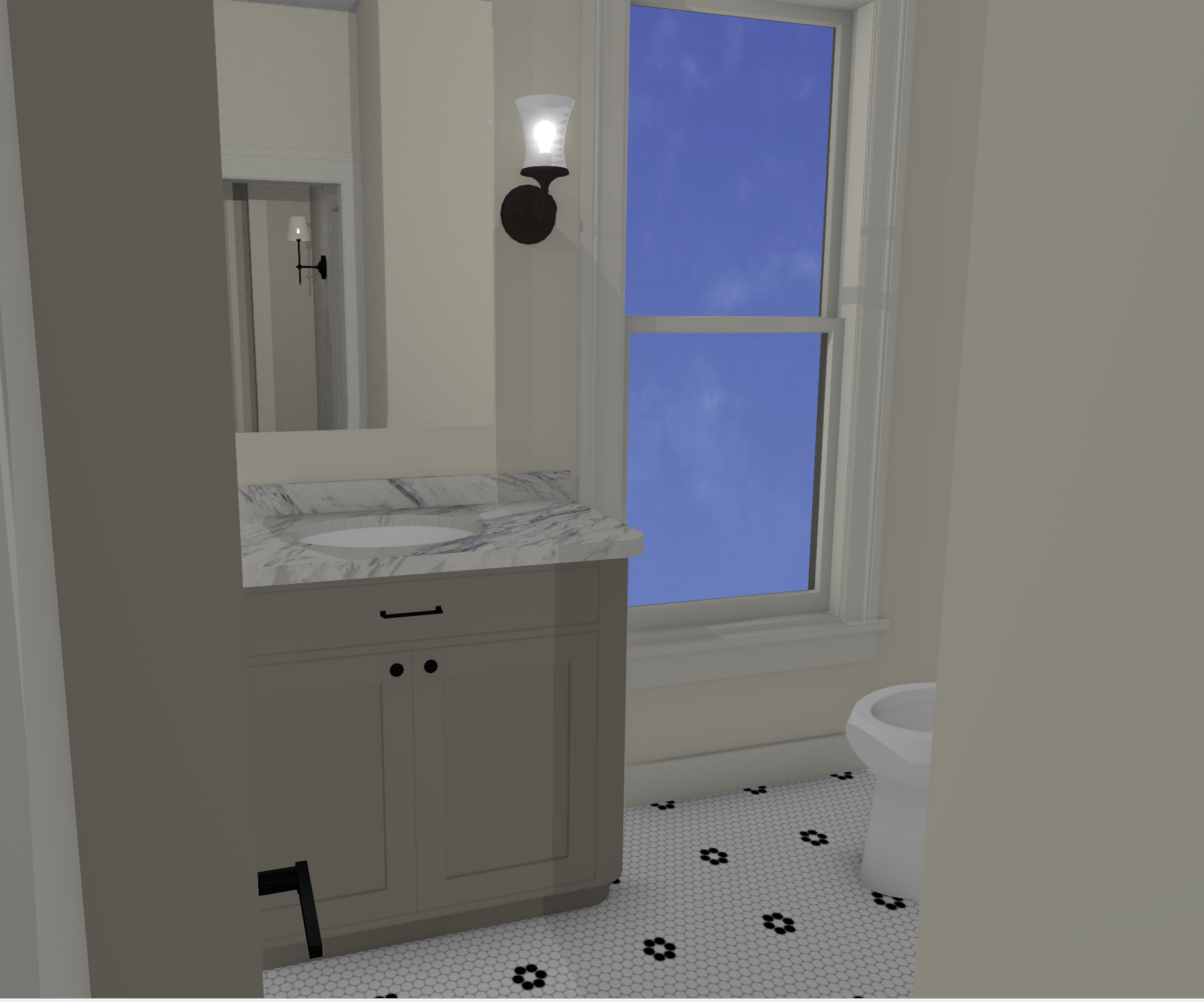 zaha hadid interior shot i want this rendering made photo realistic i want the floor to be white penny tile with a black penny border like the example attached i want the vanity to be blond oak curved corners and marble top marble backsplash with curved corner detail pinch pleat cafe curtain on lower 50 sash of window window is second floor looking over backyard nickel faucet with widespread handle contemporary matte black hardware on vanity walls painted sw alabaster do floor to ceiling 5 nickel gap smooth paneling running vertical seams around the room 6 flat stock baseboard architecture